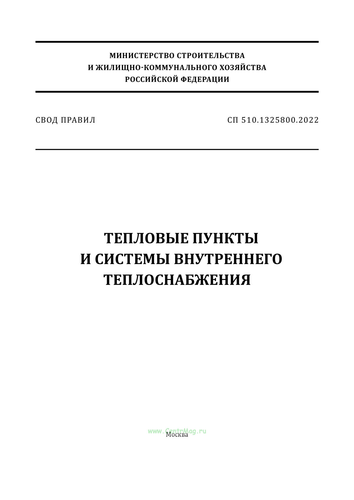 СП 510.1325800.2022 "Тепловые пункты и системы внутреннего теплоснабжения" утв. приказом Министерства строительства и жилищно-коммунального хозяйства Российской Федерации от 25 января 2022 г. № 42/пр и введен в действие с 26 февраля 2022 г.