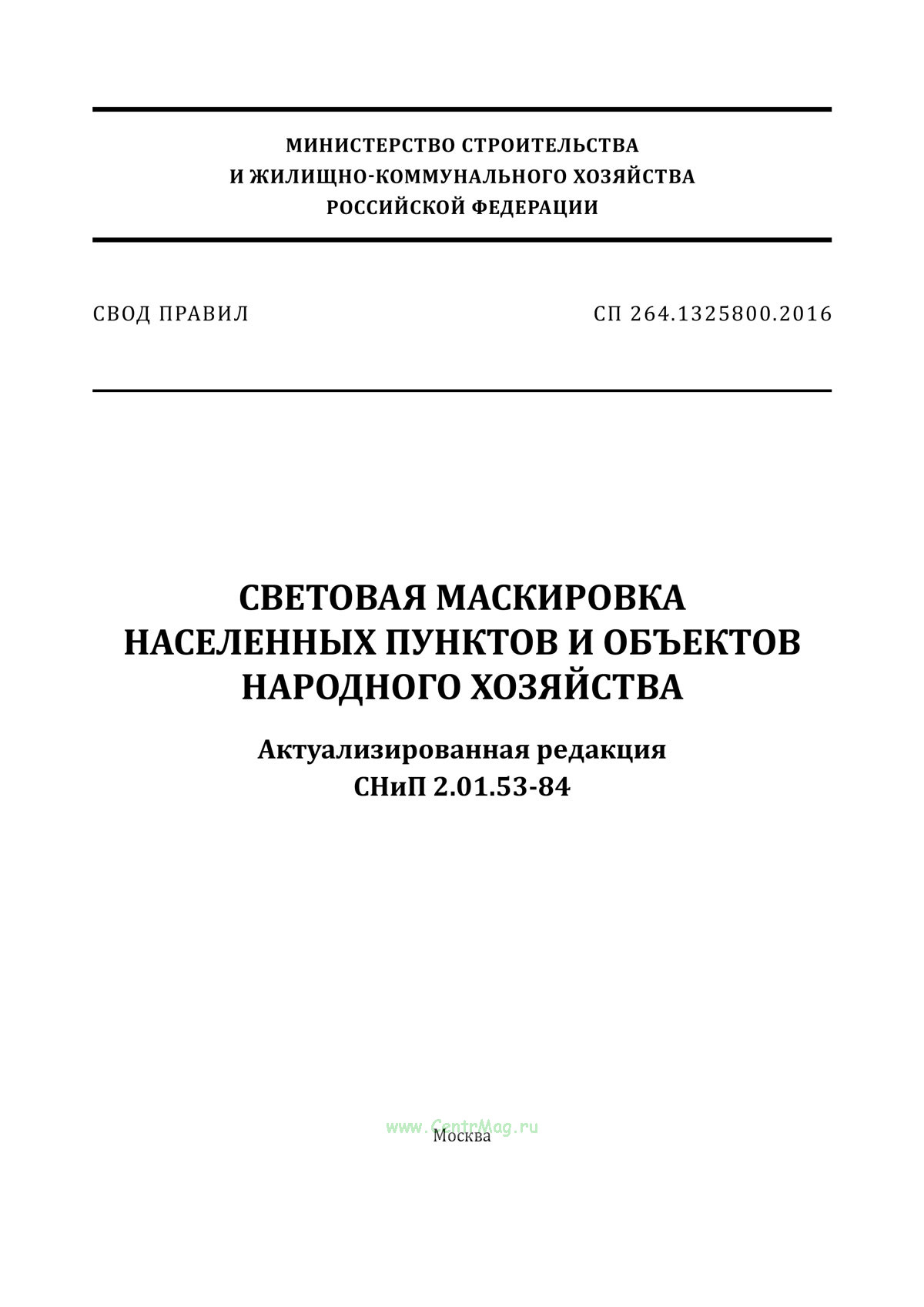 "СП 264.1325800.2016. Свод правил. Световая маскировка населенных пунктов и объектов народного хозяйства. Актуализированная редакция СНиП 2.01.53-84"утв. Приказом Минстроя России от 03.12.2016 N 880/пр
