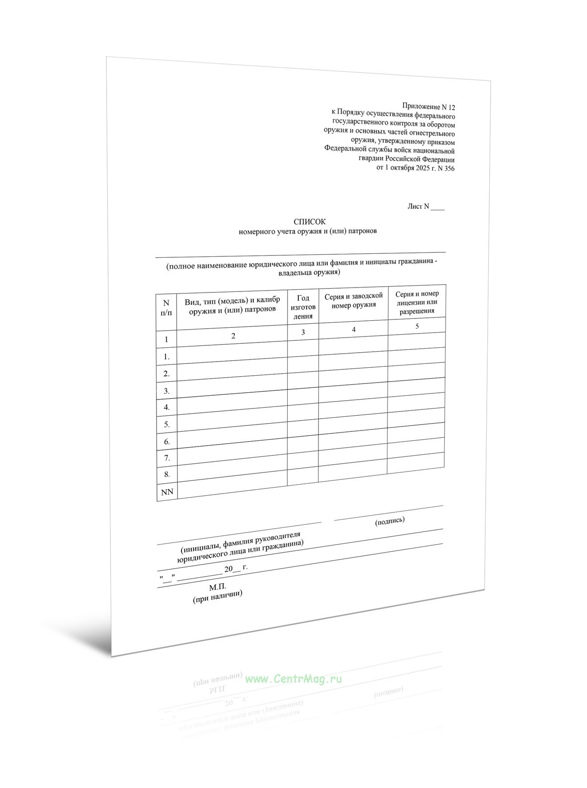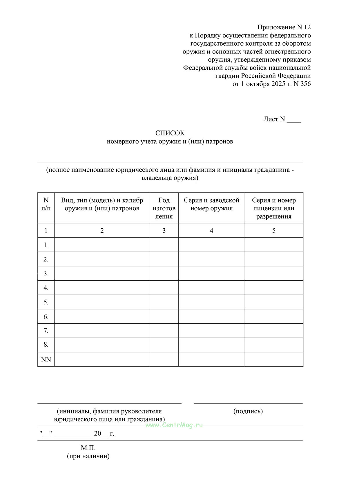 Форма Списка номерного учета оружия и (или) патронов соответствует Приложению 12 к Приказу Росгвардии от 01.10.2025 N 356 "Об утверждении Порядка осуществления федерального государственного контроля за оборотом оружия и основных частей огнестрельного оружия"