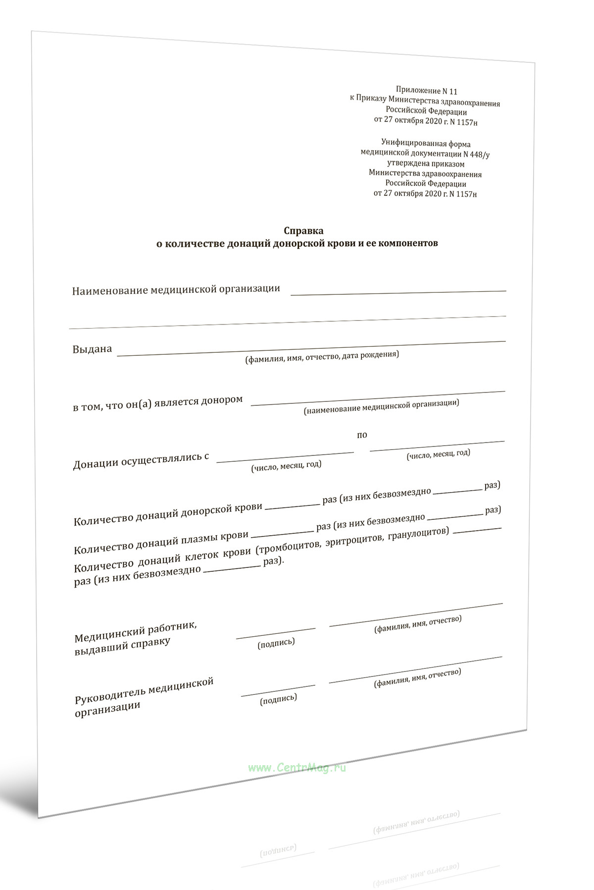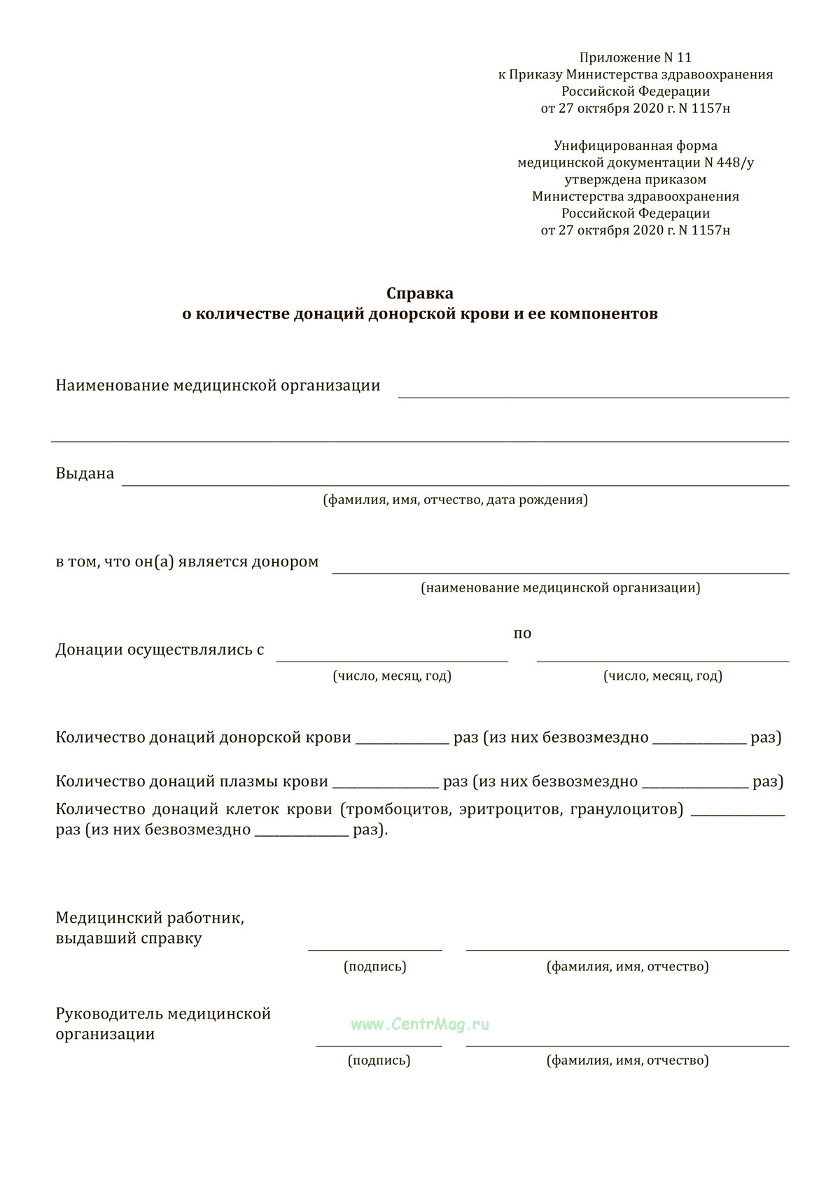 Форма справки соответствует Приложению 11 к Приказу Минздрава России от 27.10.2020 N 1157н "Об утверждении унифицированных форм медицинской документации, в том числе в форме электронных документов, связанных с донорством крови и (или) ее компонентов и клиническим использованием донорской крови и (или) ее компонентов, и порядков их заполнения".
