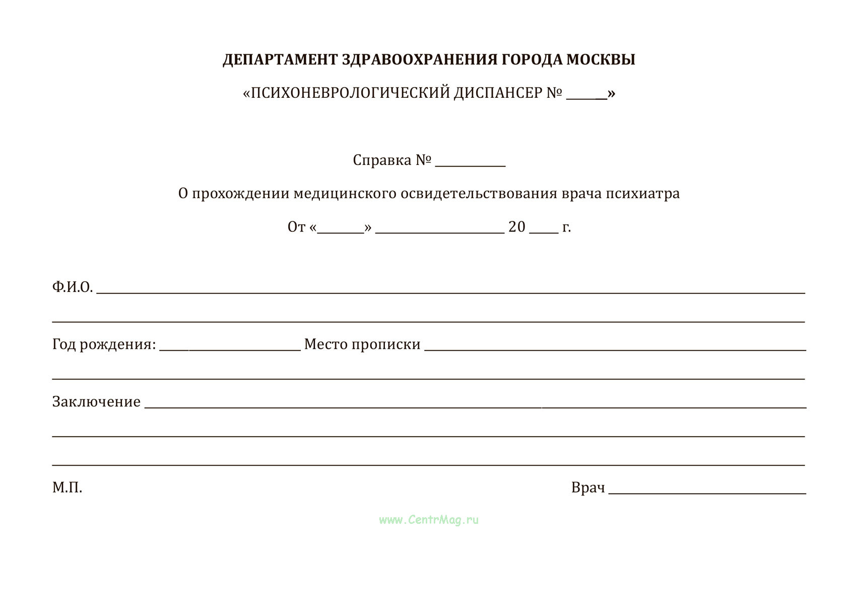 Справка из психоневрологического диспансера применяется для подтверждения прохождения медицинского освидетельствования у врача-психиатра. Она содержит сведения о личности обследуемого, дате обследования, заключении врача и заверяется подписью и печатью . Используется при устройстве на работу, получении водительских прав, оформлении оружия и в других случаях, когда требуется подтверждение психической пригодности.