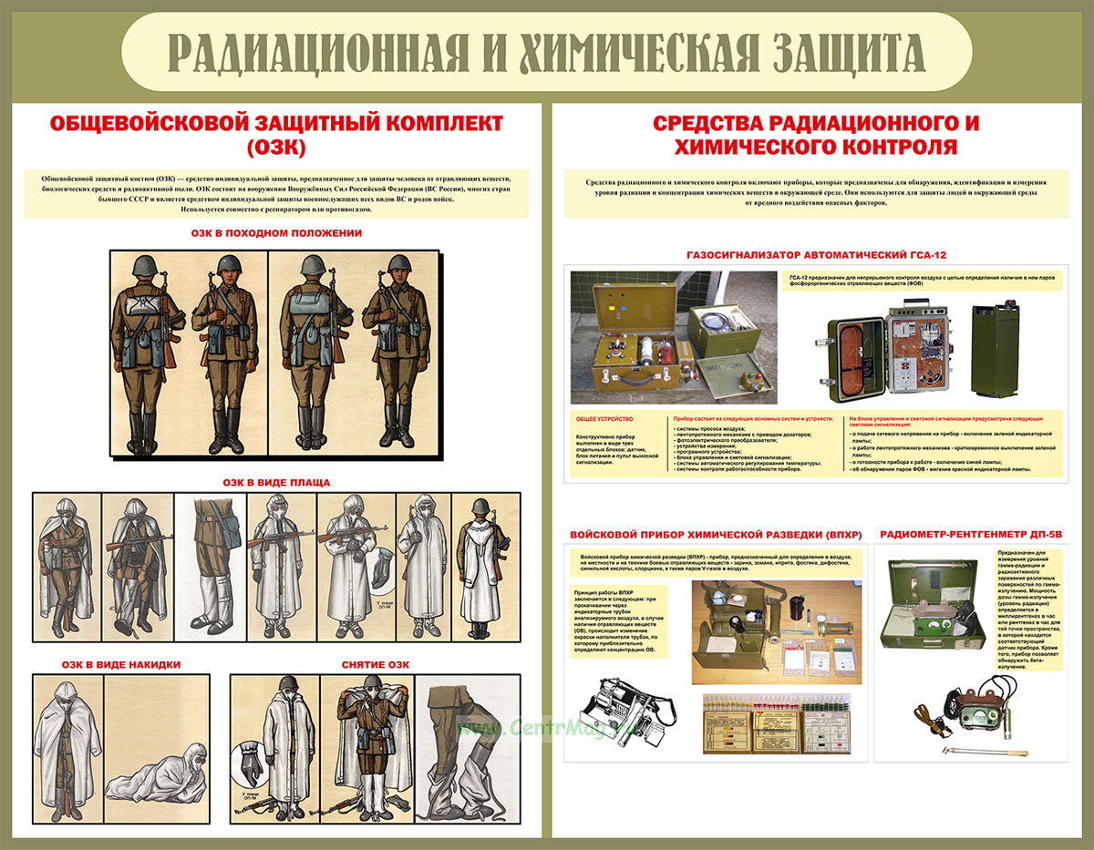 Стенд посвящен средствам индивидуальной защиты и радиационно-химическому контролю в условиях опасных факторов. В нем представлены основные виды защитных костюмов (ОЗК), их конструкции и способы использования в походных условиях, а также средства радиационного и химического контроля, такие как автоматический газосигнализатор ГСА-12 и приборы химической разведки ВПХР. Плакат содержит информацию о принципах работы, конструктивных особенностях и назначении этих средств, что важно для обеспечения безопасности военнослужащих и специалистов при выполнении задач в условиях химической, радиационной и биологической угрозы.