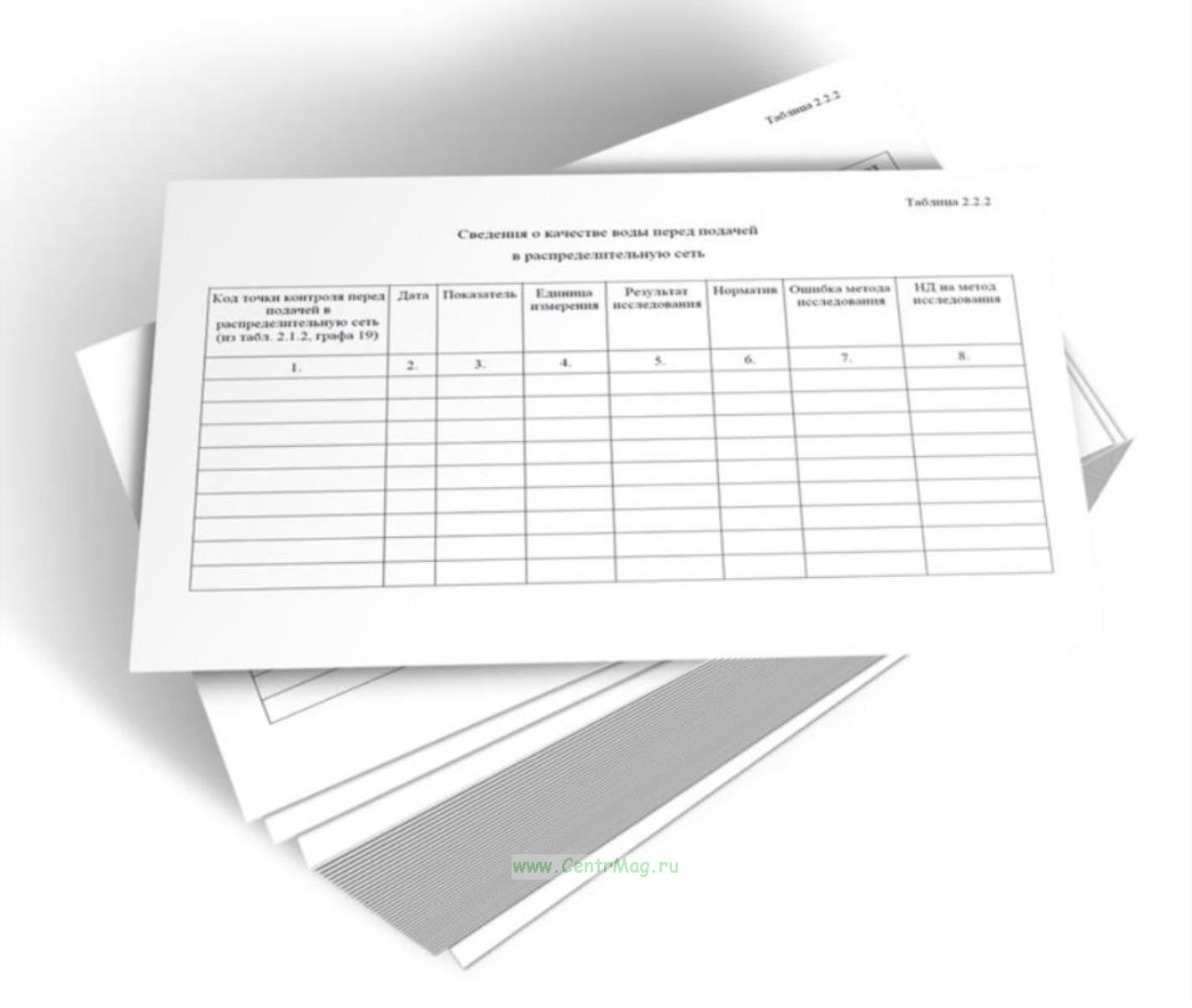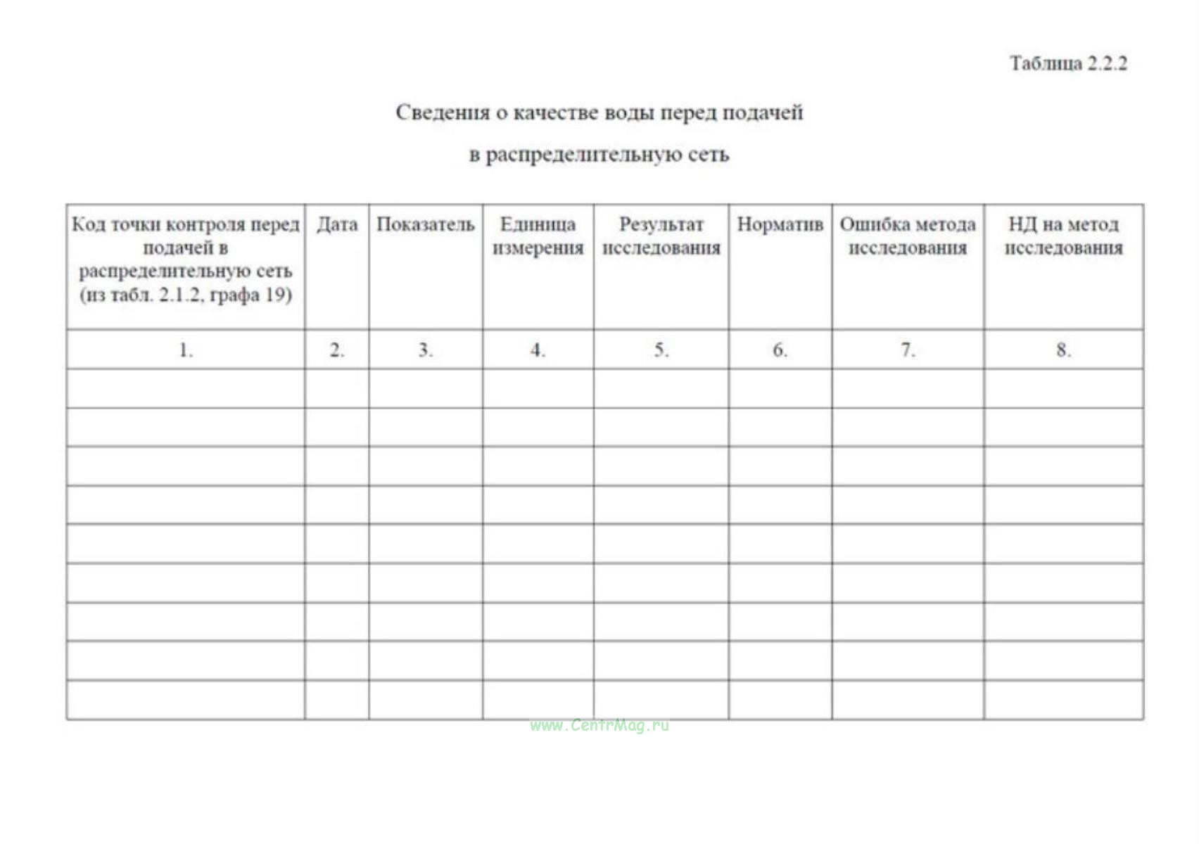 Форма бланка соответствует Приложению 2 (Таблица 2.2.2) к "МР 2.1.4.0176-20. 2.1.4. Питьевая вода и водоснабжение населенных мест. Организация мониторинга обеспечения населения качественной питьевой водой из систем централизованного водоснабжения. Методические рекомендации"