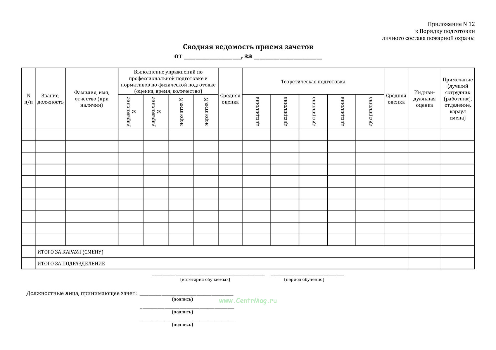 Форма Сводной ведомости приема зачетов соответствует Приложению 12 к Приказу МЧС России от 05.02.2025 N 77 "Об утверждении Порядка подготовки личного состава пожарной охраны"