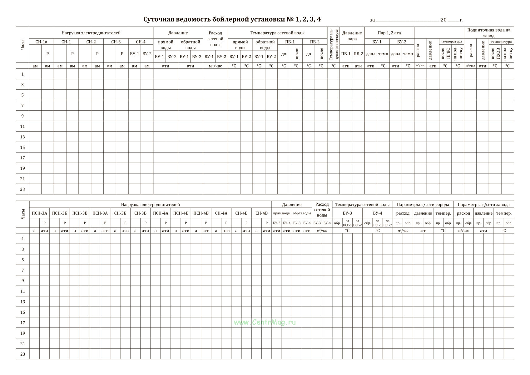 Суточная ведомость бойлерной установки применяется для почасового контроля параметров работы оборудования: давления, температур, расхода воды и пара, а также нагрузки электродвигателей. Она обеспечивает ведение технологического учёта и позволяет оперативно отслеживать отклонения в работе бойлерных блоков и теплосетей.