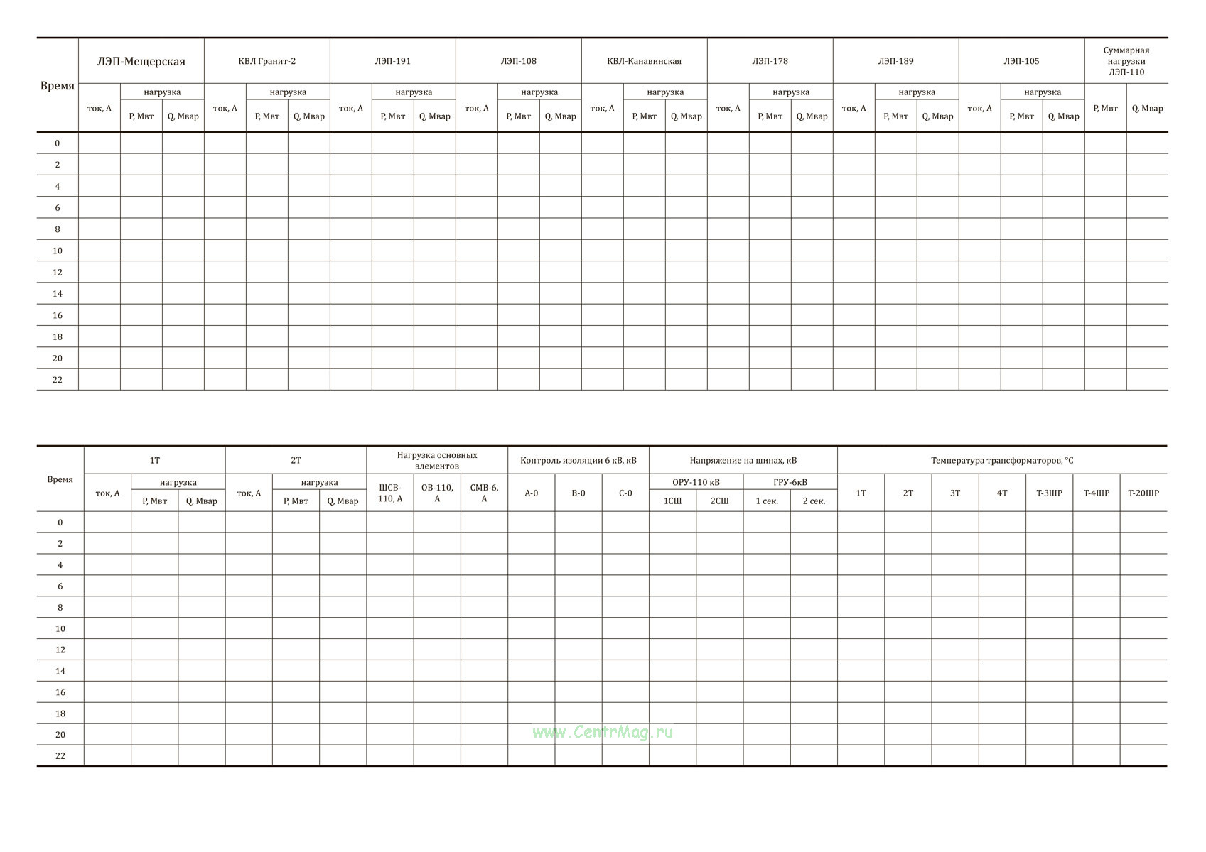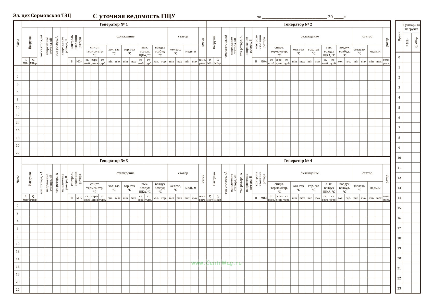Ведомость применяется для почасового контроля параметров работы генераторов, трансформаторов, линий электропередачи и собственных нужд станции. Она фиксирует электрические нагрузки, токи, напряжения, температуры, охлаждение и контроль изоляции, обеспечивая надёжность электроснабжения и оперативный анализ работы оборудования.