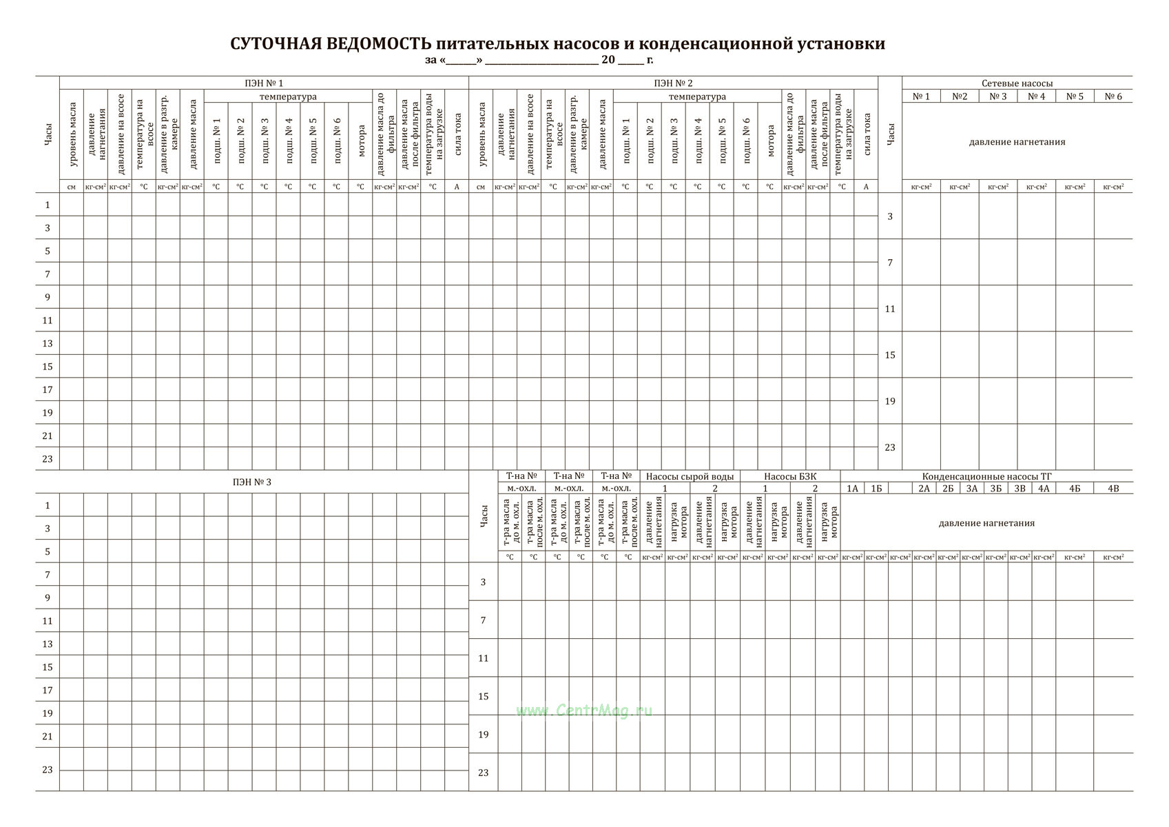 Суточная ведомость питательных насосов и конденсационной установки
