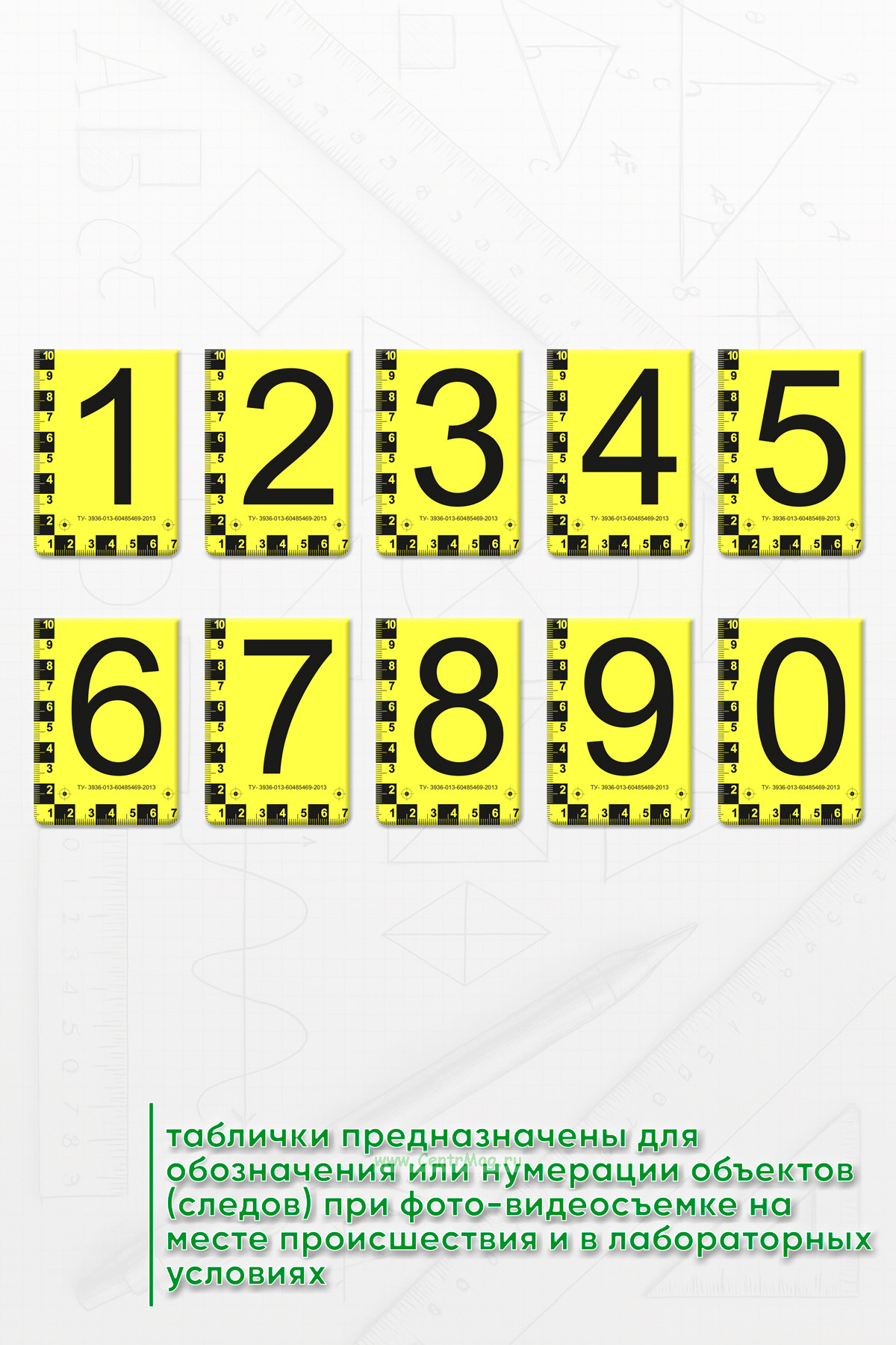 Таблички предназначены для обозначения или нумерации объектов (следов) при фото-видеосъемке на месте происшествия и в лабораторных условиях.