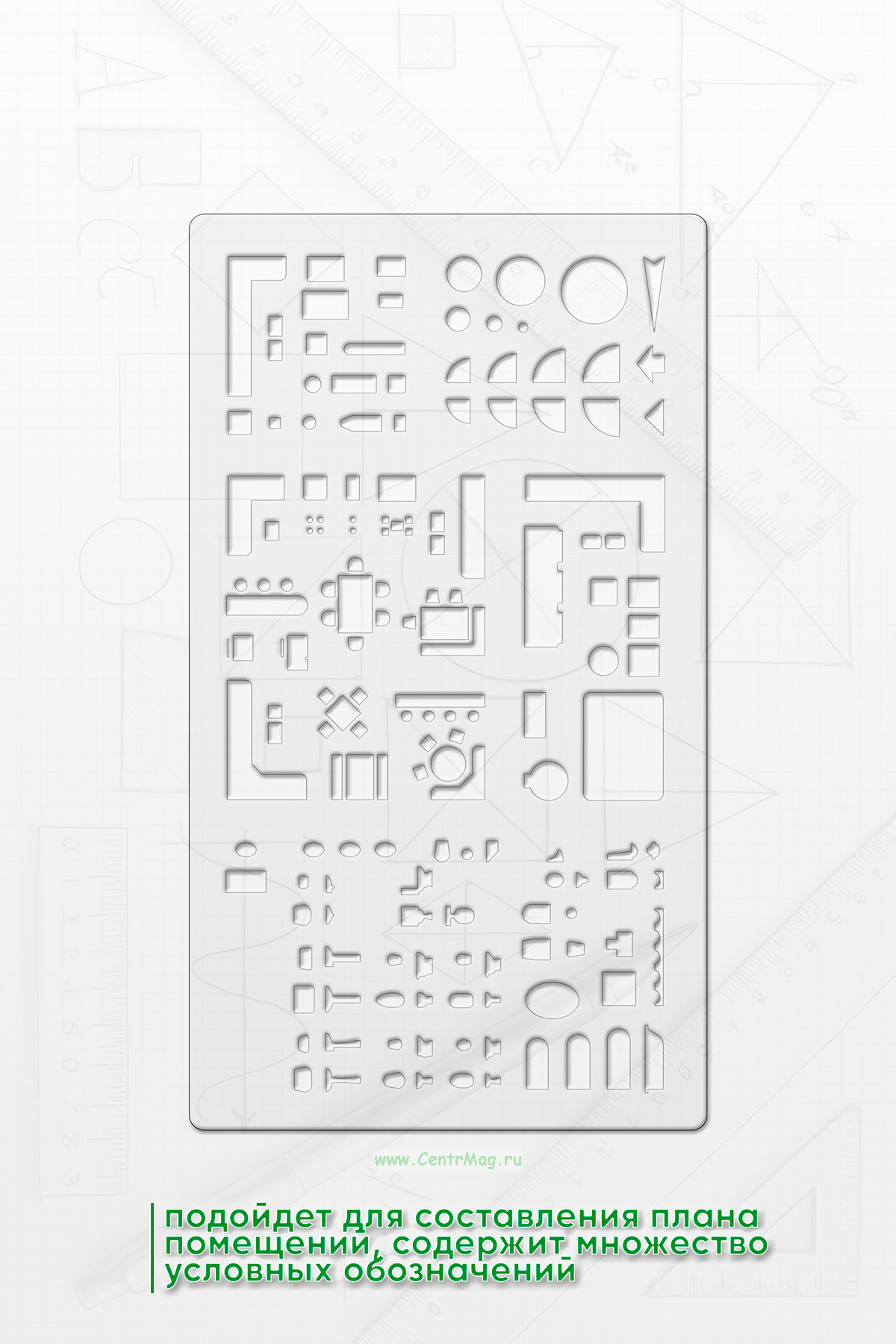 Технический трафарет идеально подойдет для составления плана помещений, содержит множество условных обозначений.