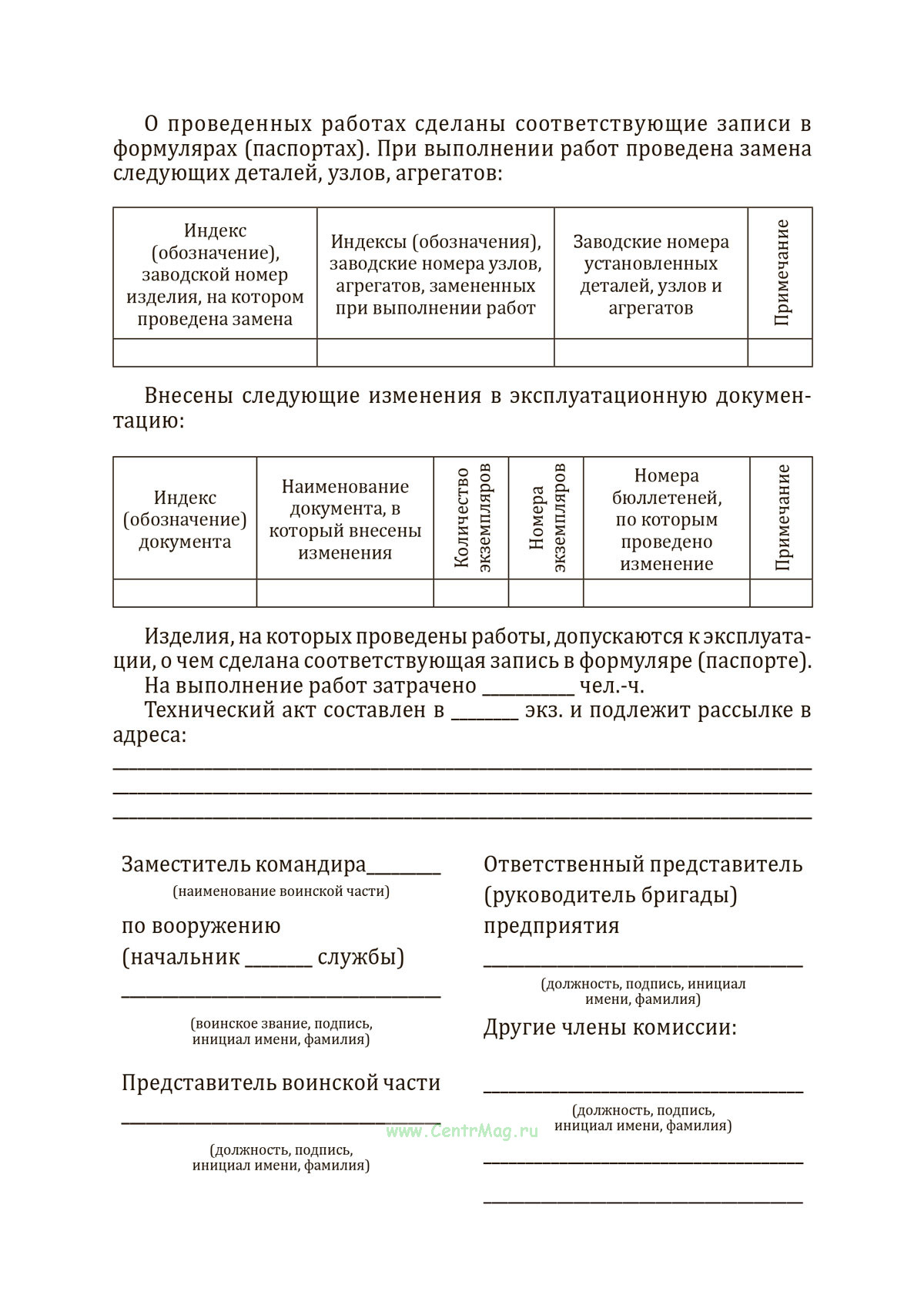 Выполнение работ оформляется техническим актом проведения работ по бюллетеням. Акт утверждается командиром воинской части и высылается в пяти экземплярах начальнику технической службы военного округа, один экземпляр остается в воинской части.