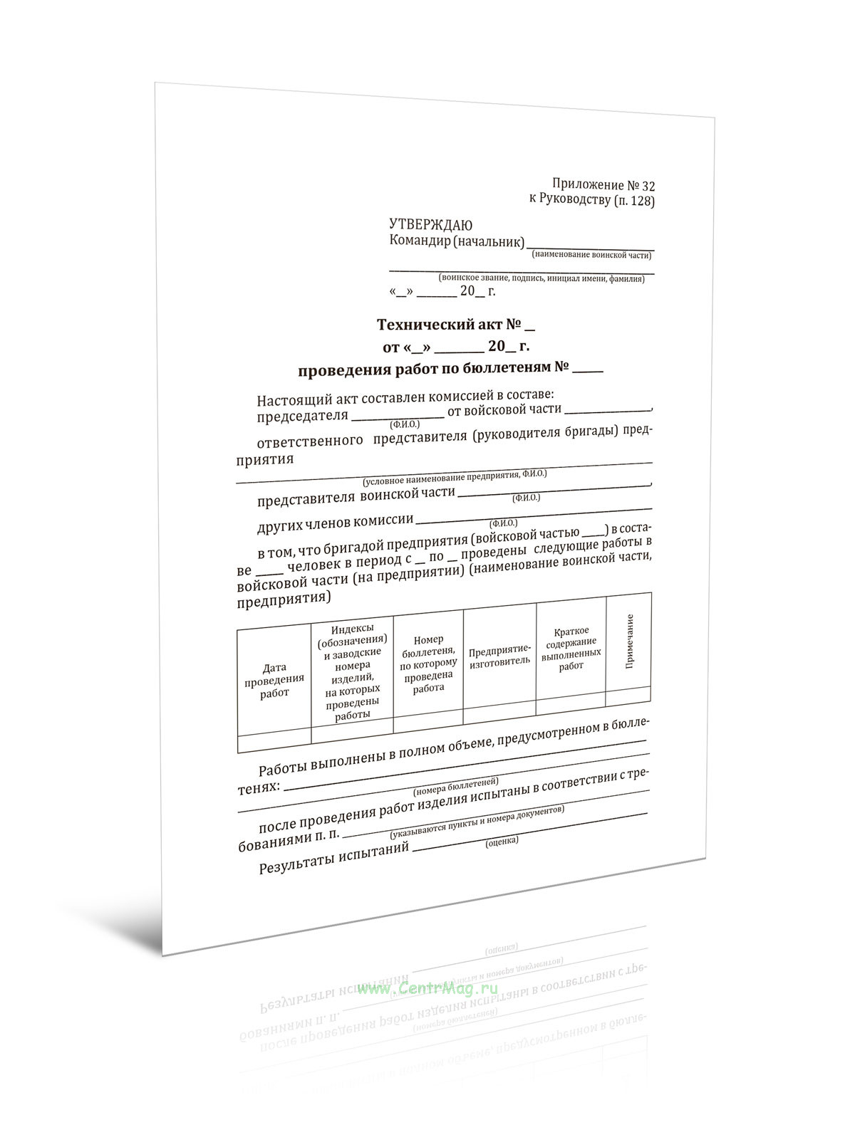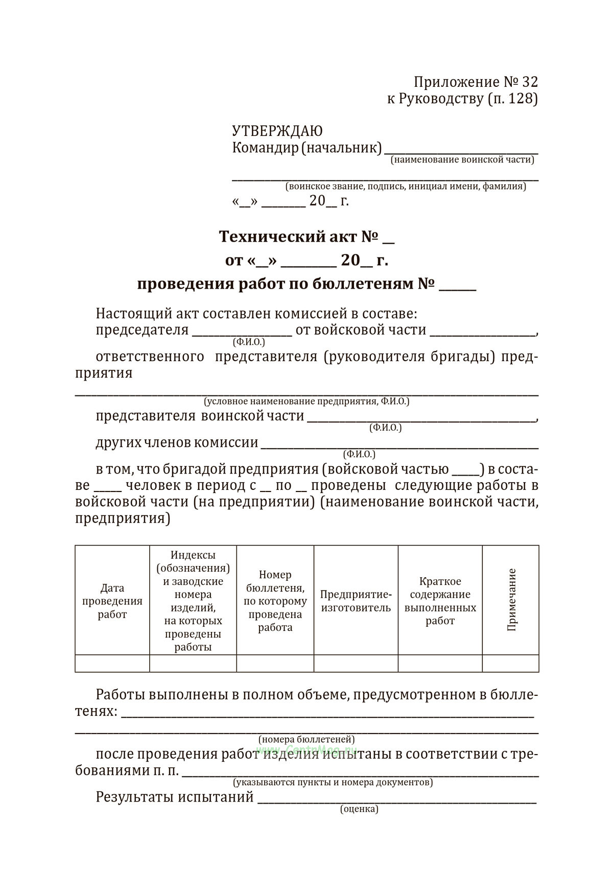 Форма Технического акта проведения работ по бюллетеням соответствует Приложению № 32 Приказу Министра обороны РФ от 28.12.2013 N 969 "Об утверждении Руководства по содержанию вооружения и военной техники общевойскового назначения, военно-технического имущества в Вооруженных Силах Российской Федерации"