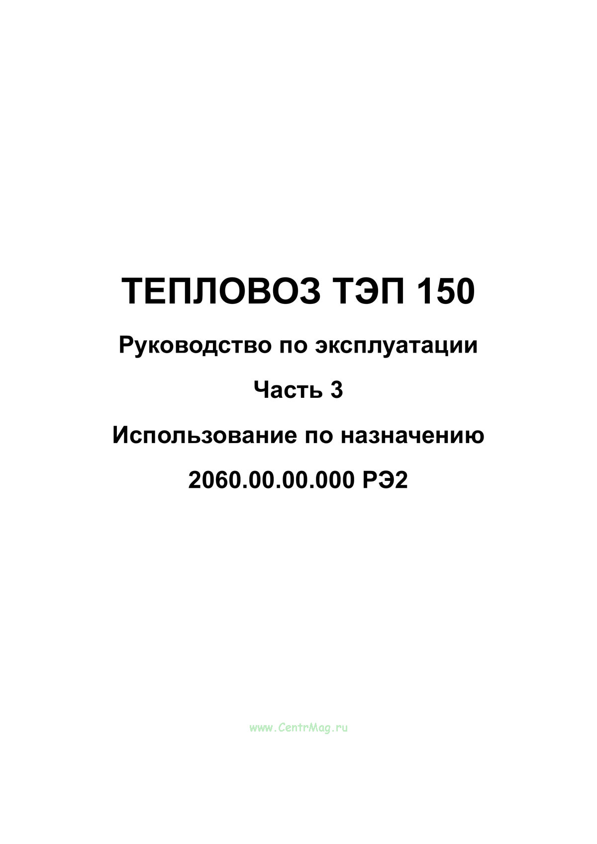 Настоящее руководство предназначено для изучения устройства тепловоза ТЭП 150, его эксплуатации, обслуживания и ремонта.