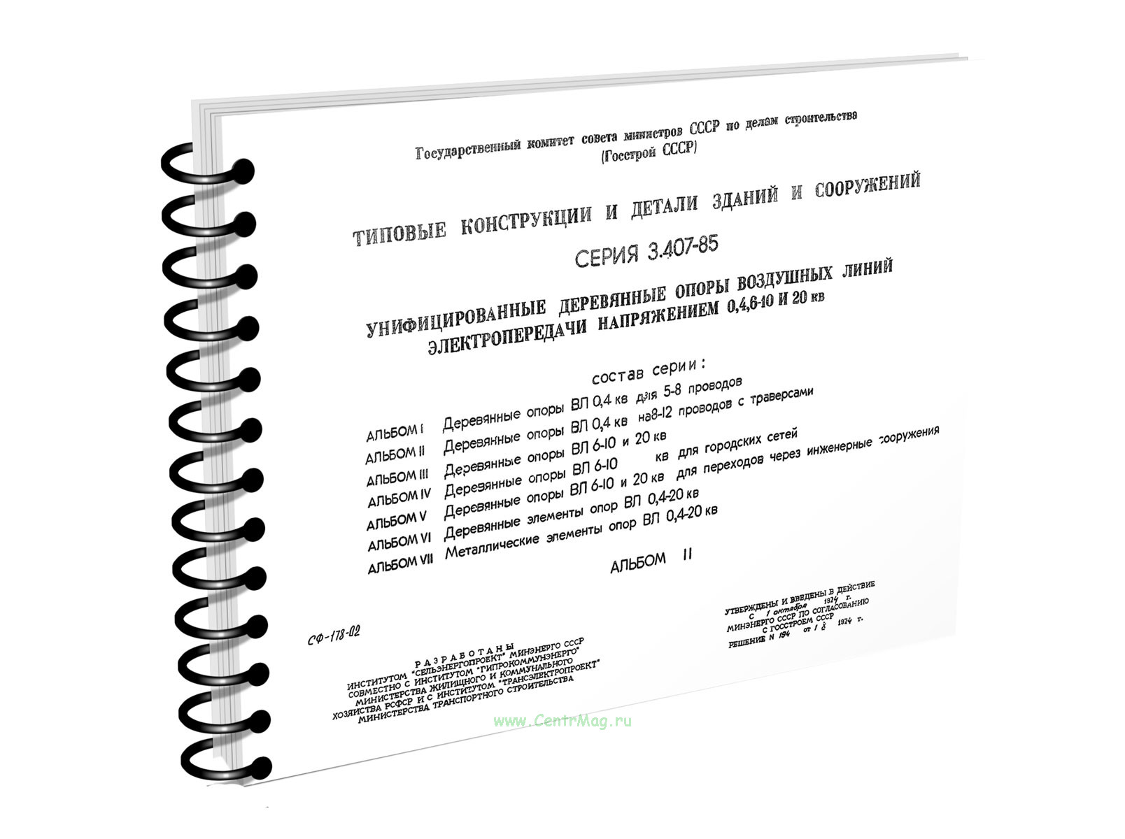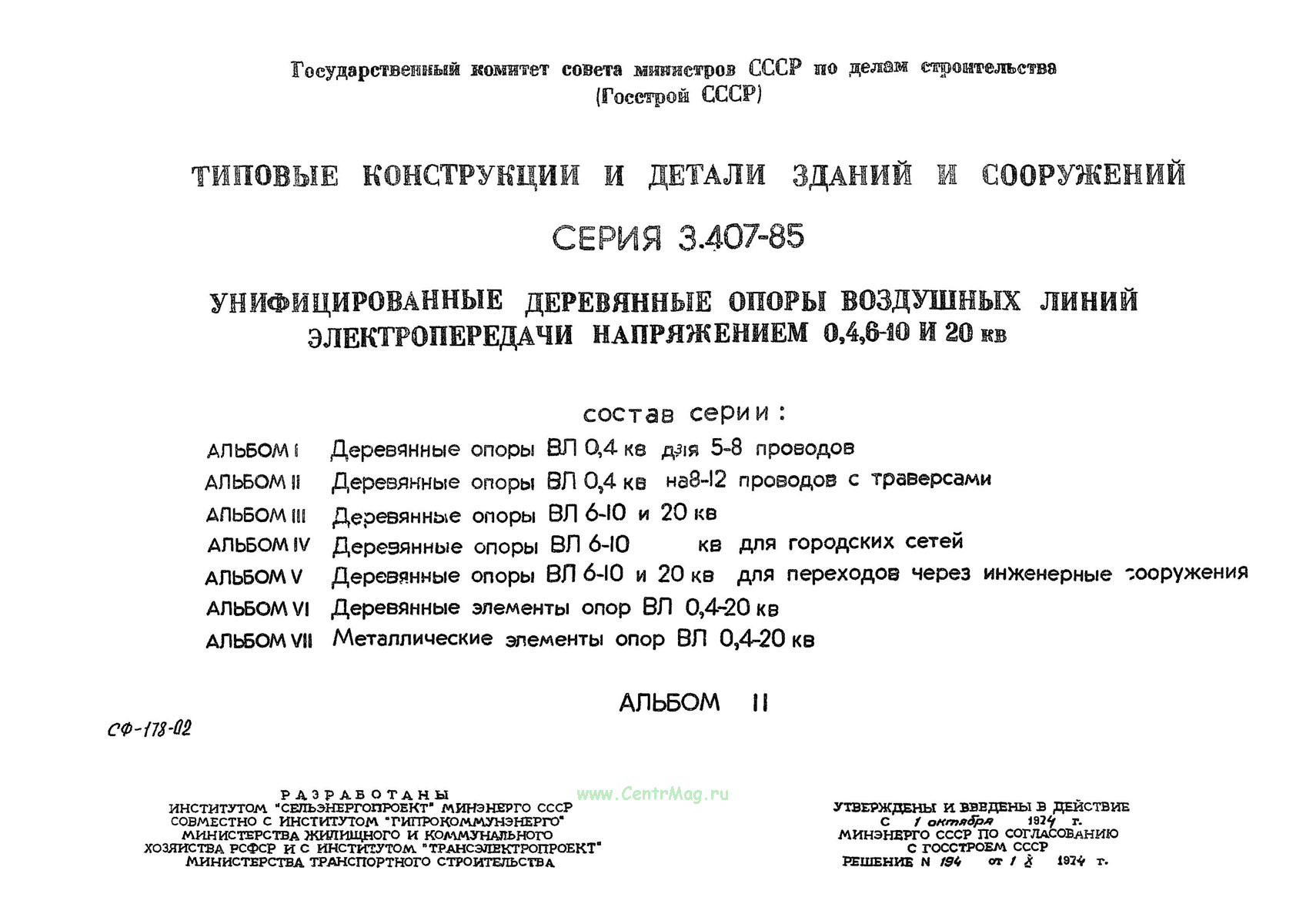 "Типовые конструкции и детали зданий и сооружений. Серия 3.407-85. Унифицированные деревянные опоры воздушных линий электропередачи напряжением 0,4,6-10 и 20 кВ. Альбом II" утверждены и введены в действие с 1 октября 1974г. Минэнерго СССР по согласованию Госстроем СССР решением N 194 от 1 X 1974