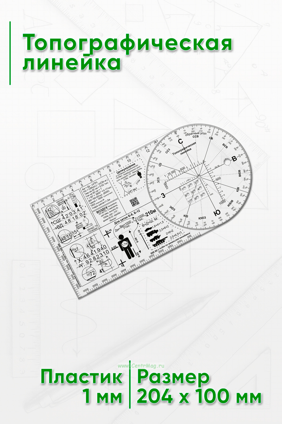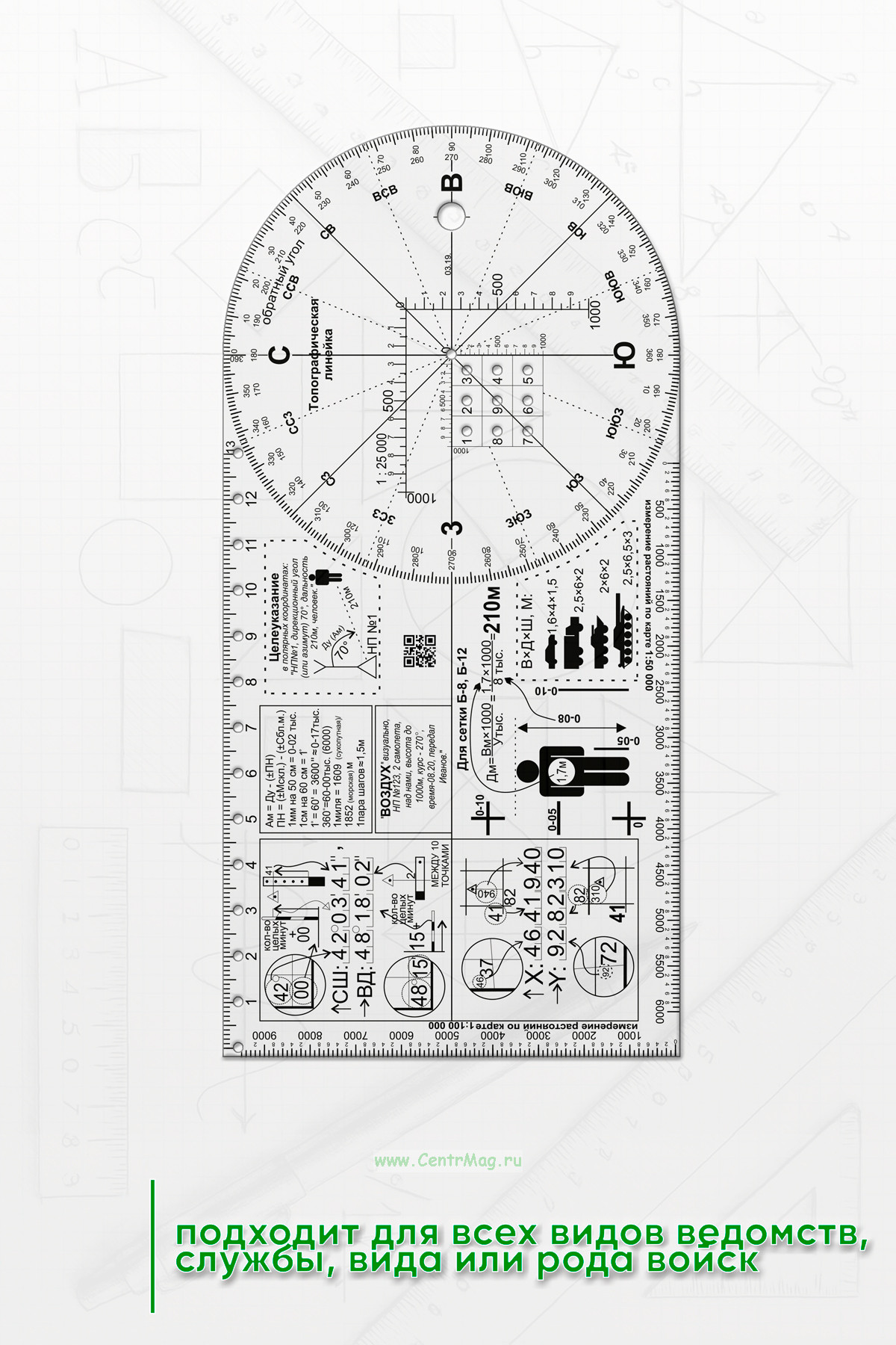Топографическая линейка содержит большое количество тактических элементов и условных обозначений. Подходит для всех видов ведомств, службы, вида или рода войск.