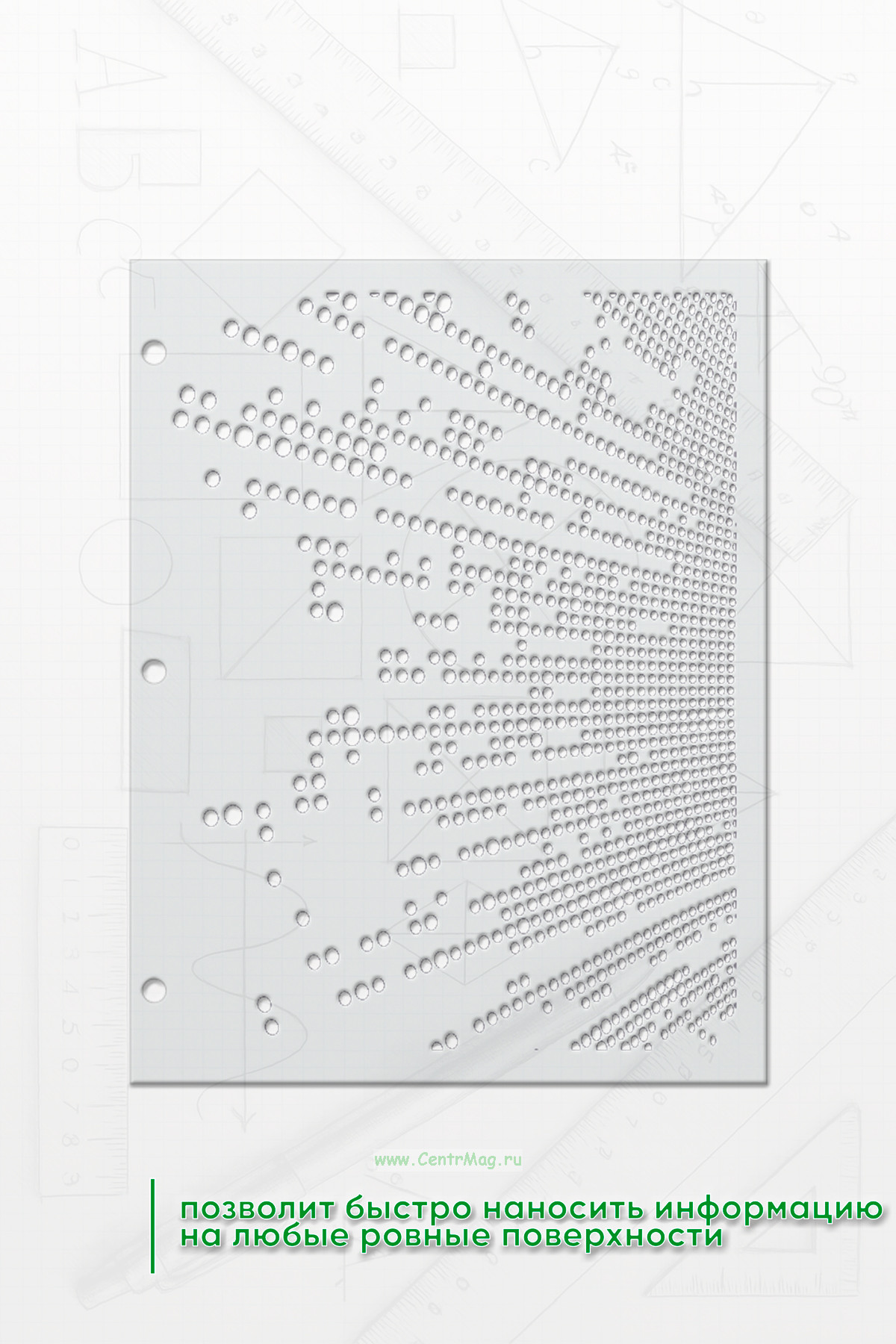 Трафарет позволит быстро наносить информацию на любые ровные поверхности. Прочный и упругий материал позволяет пользоваться трафаретом много раз.