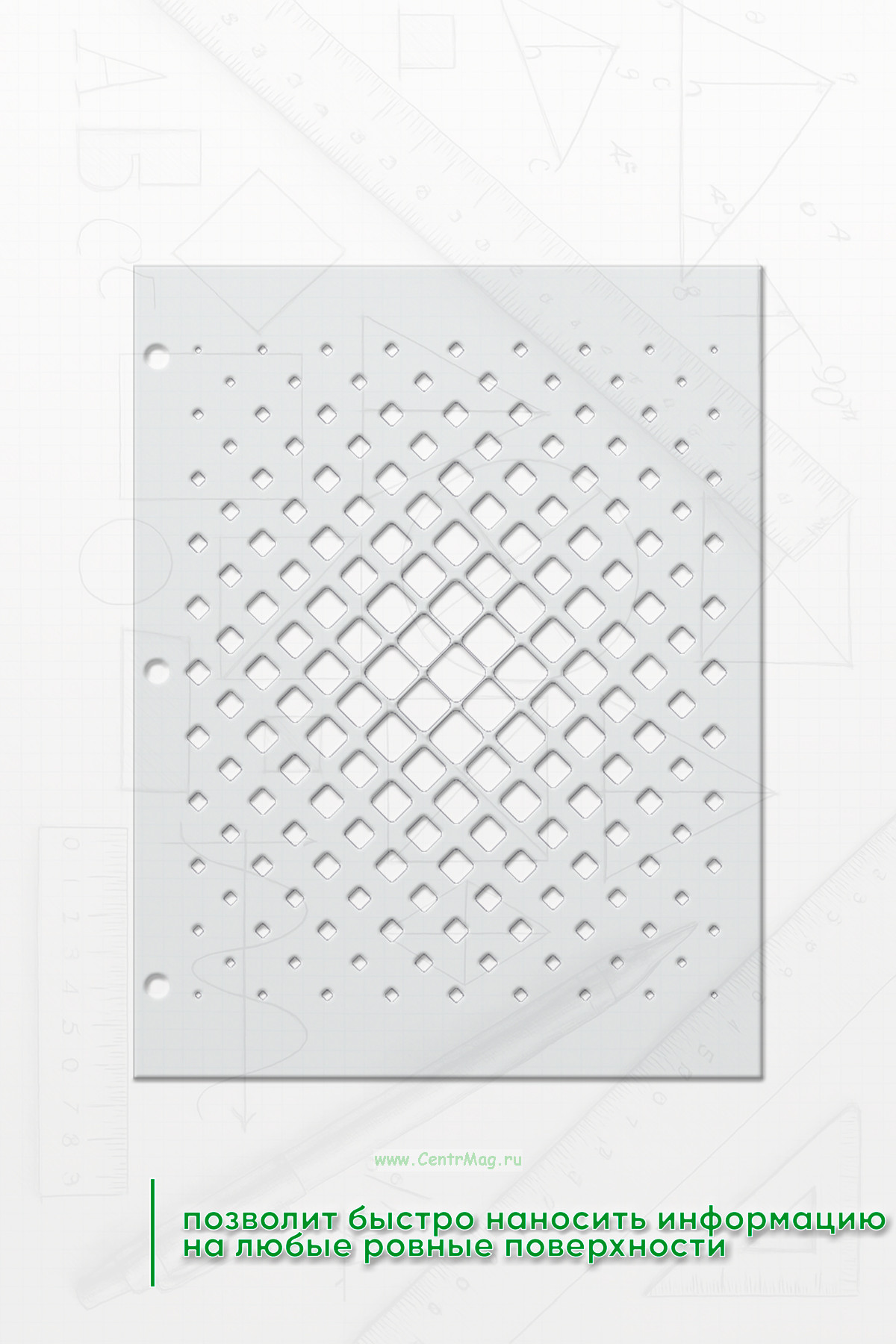 Трафарет позволит быстро наносить информацию на любые ровные поверхности. Прочный и упругий материал позволяет пользоваться трафаретом много раз.