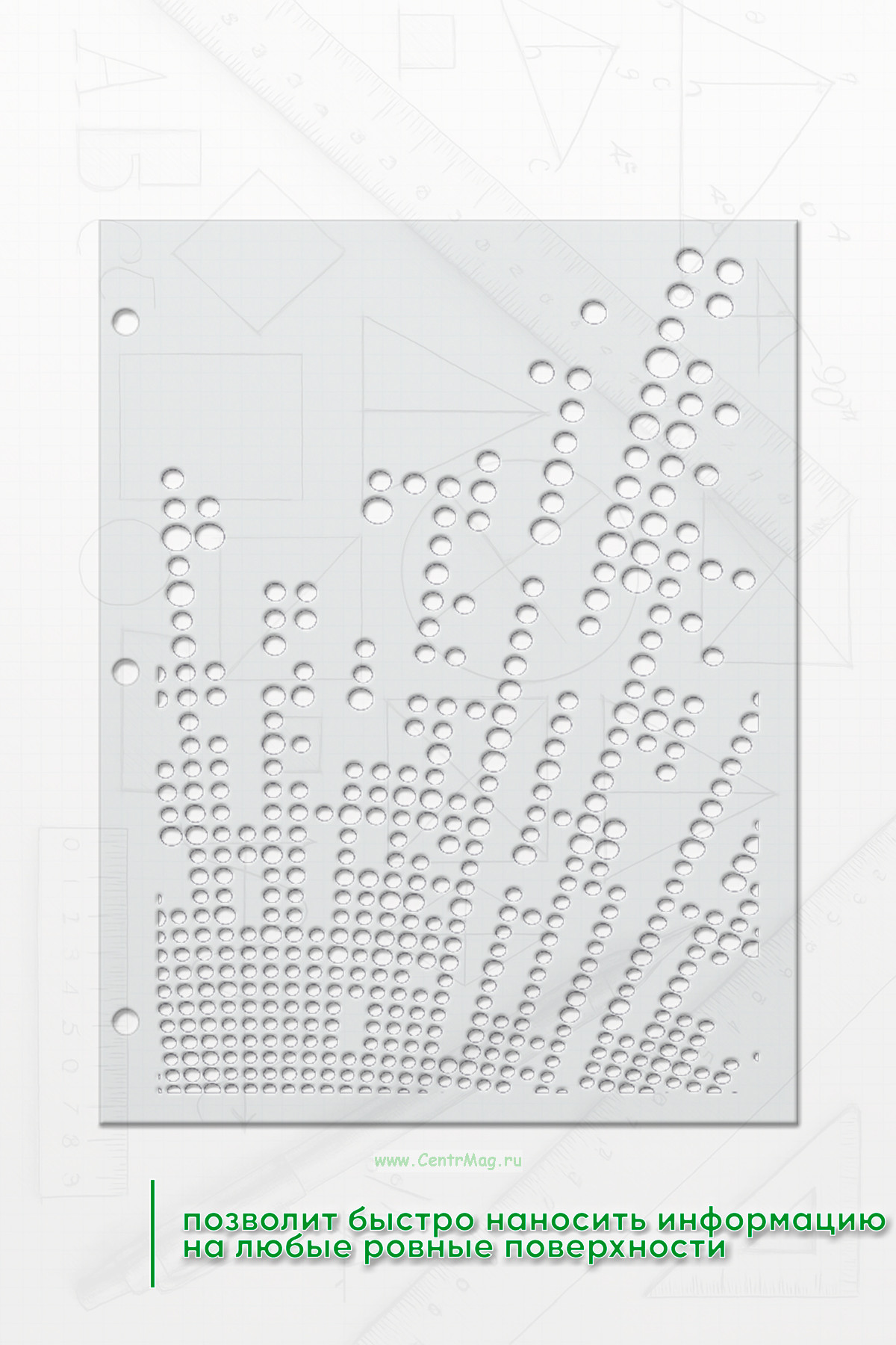 Трафарет позволит быстро наносить информацию на любые ровные поверхности. Прочный и упругий материал позволяет пользоваться трафаретом много раз.