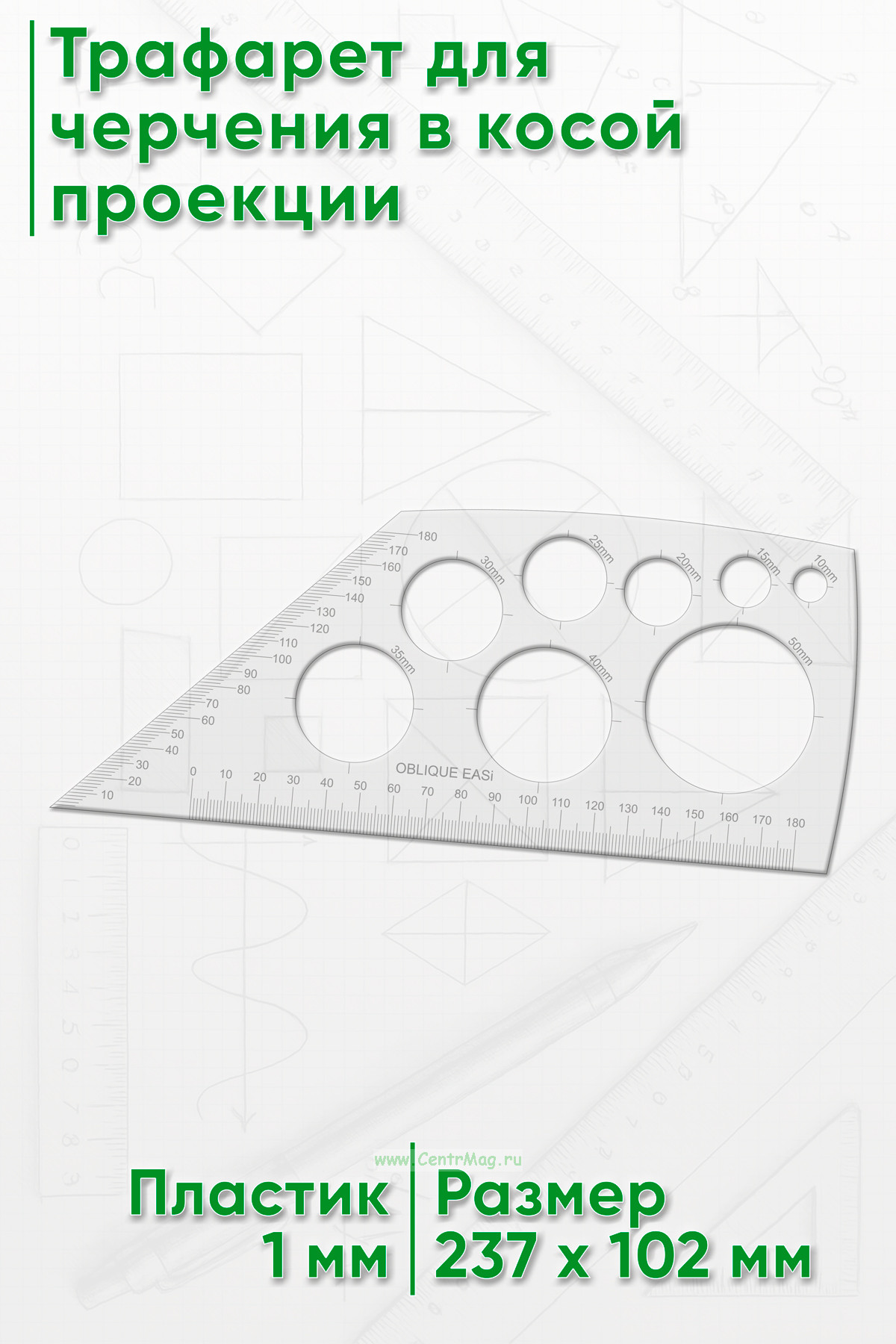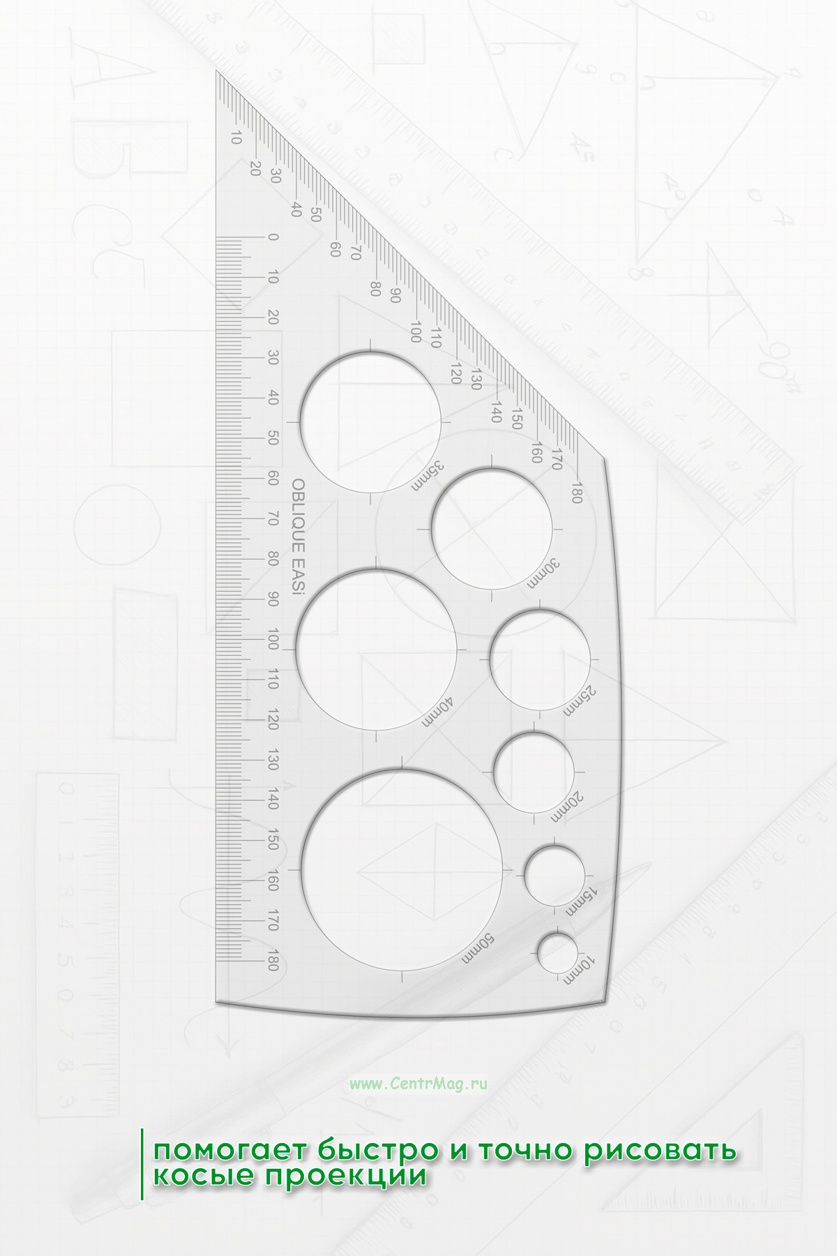 Трафарет помогает быстро и точно рисовать косые проекции. Идеально подходит для дизайнерских работ любого уровня. Этот трафарет вместе с трафаретом (для простого изометрического рисования) - единственные трафареты, которые вам понадобятся для развития у ваших учеников трехмерного рисования и создания эскизов.