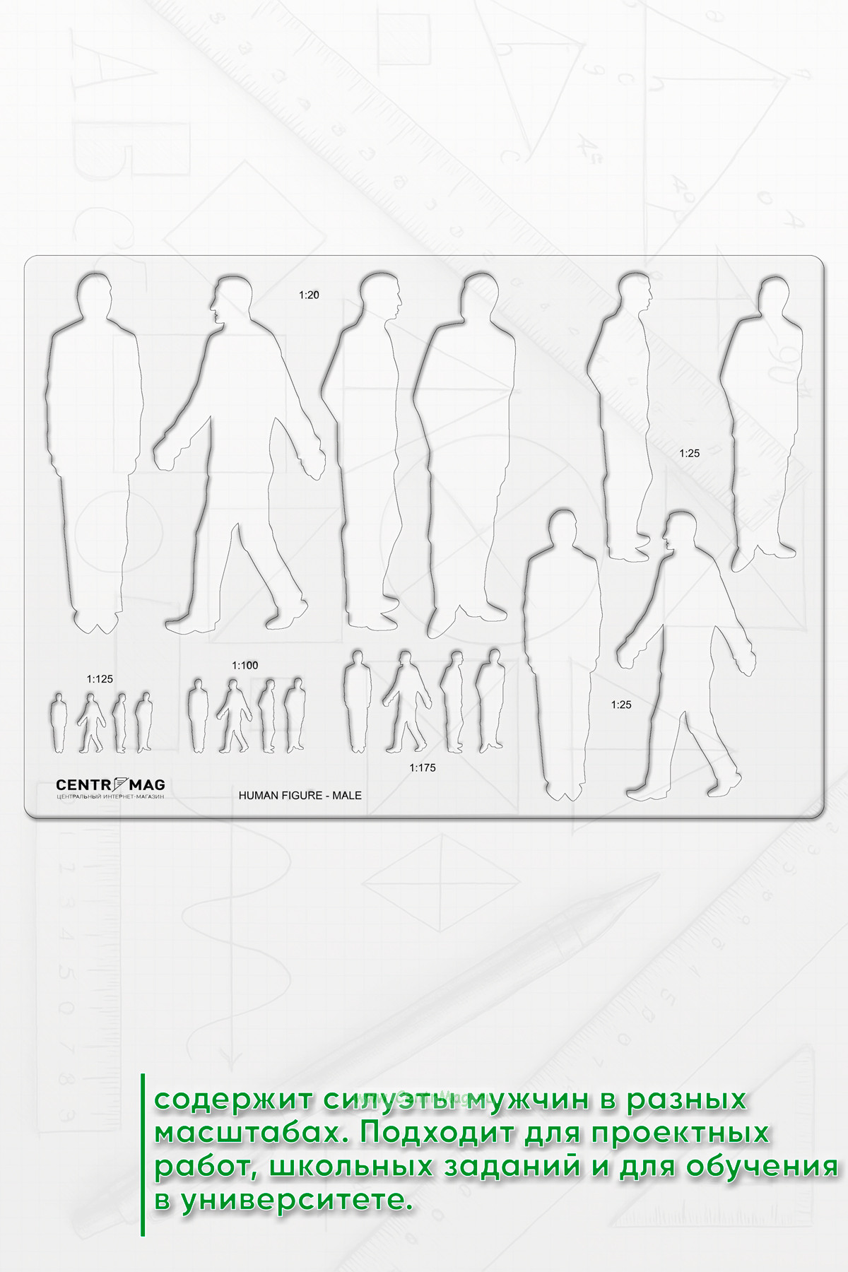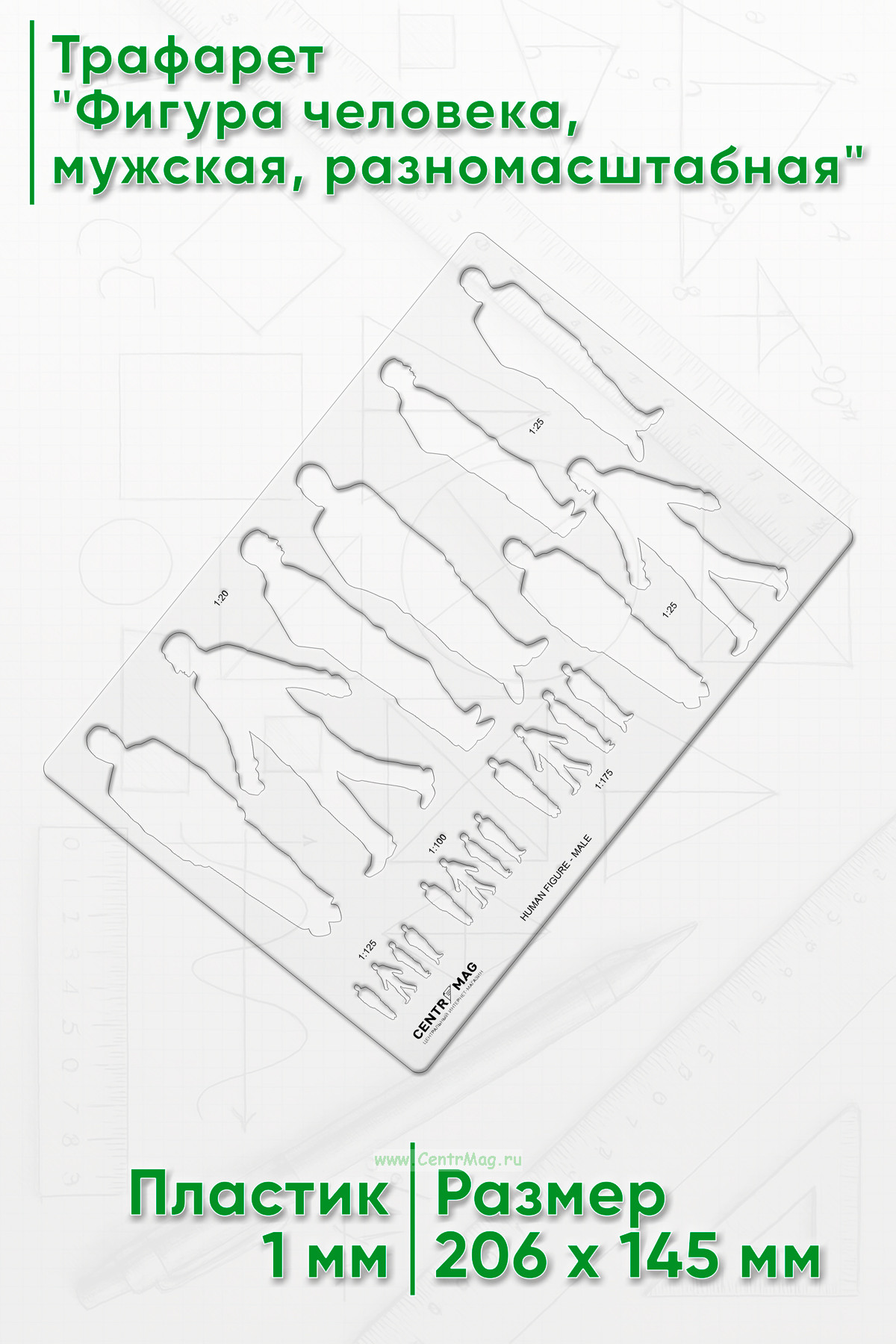 Трафарет содержит силуэты мужчин в разных масштабах. Подходит для проектных работ, школьных заданий и для обучения в университете.