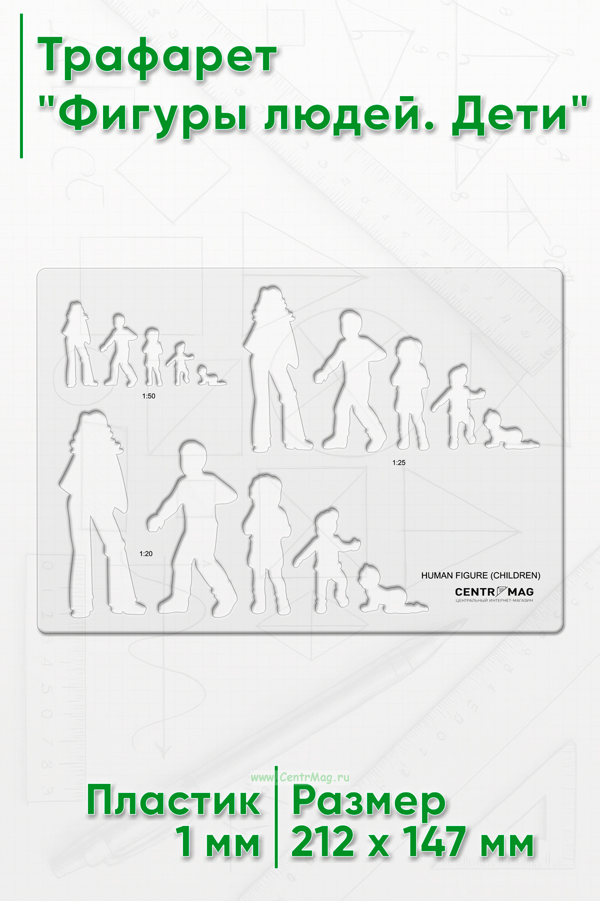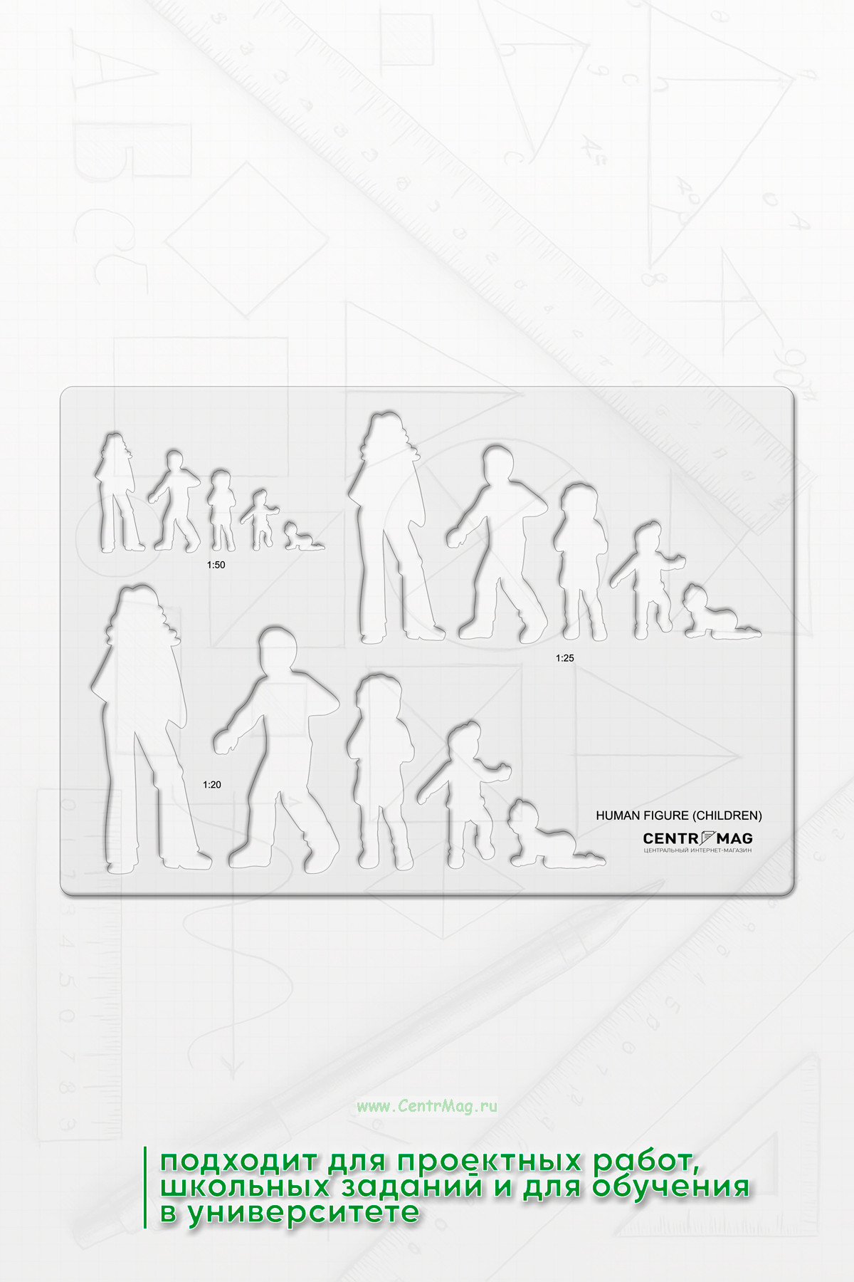 Трафарет содержит фигуры детей в разных масштабах. Подходит для проектных работ, школьных заданий и для обучения в университете.