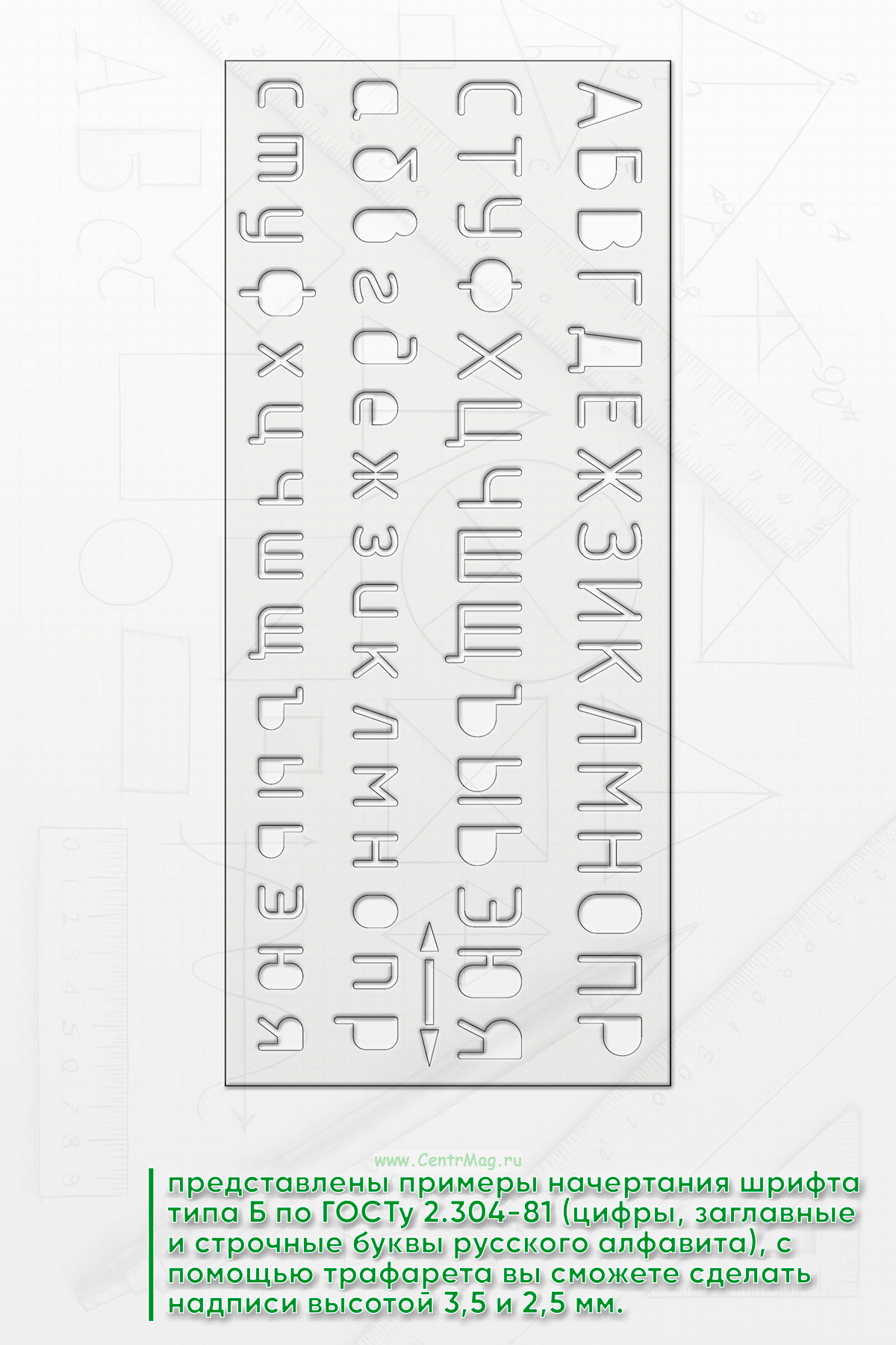 На трафарете представлены примеры начертания шрифта типа Б по ГОСТу 2.304-81 (цифры, заглавные и строчные буквы русского алфавита (кириллицы). С помощью трафарета вы сможете сделать надписи высотой 14 мм.