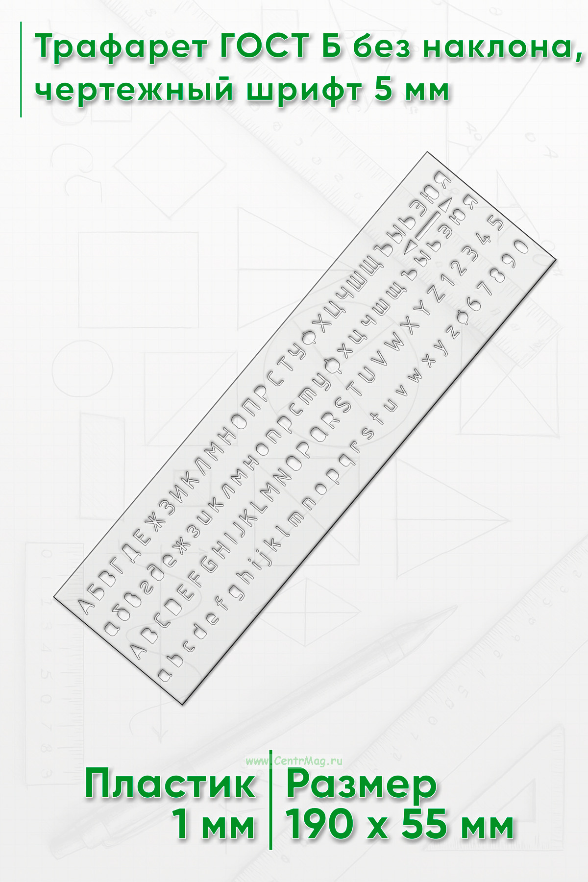Трафарет для черчения ГОСТ 2.304-81 шрифт чертежный, тип Б с наклоном, 5 мм, прорезные буквы (19х5,5 см) (390 руб.)