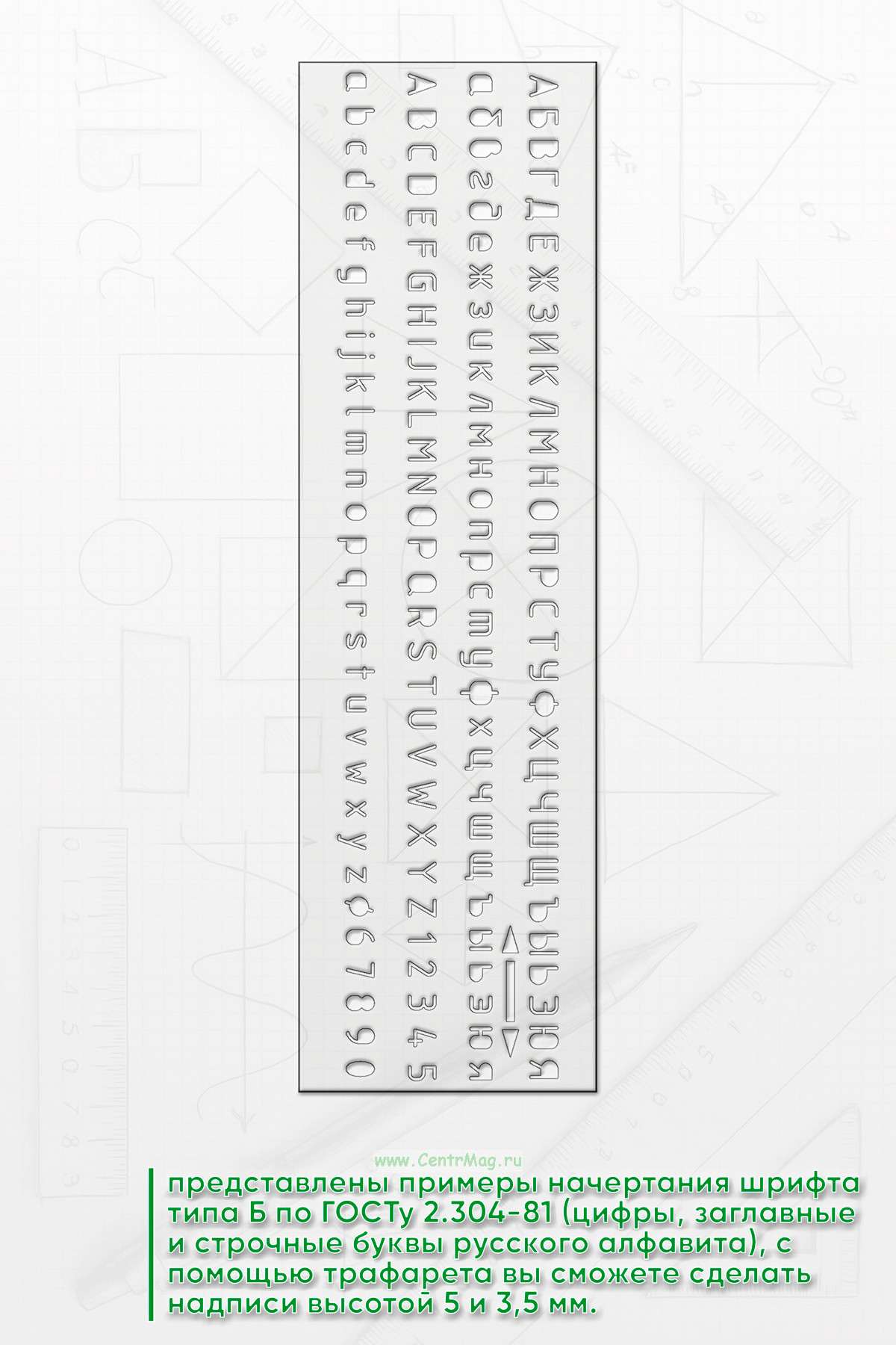 На трафарете представлены примеры начертания шрифта типа Б по ГОСТу 2.304-81 (цифры, заглавные и строчные буквы русского алфавита (кириллицы). С помощью трафарета вы сможете сделать надписи высотой 5 и 3,5 мм.