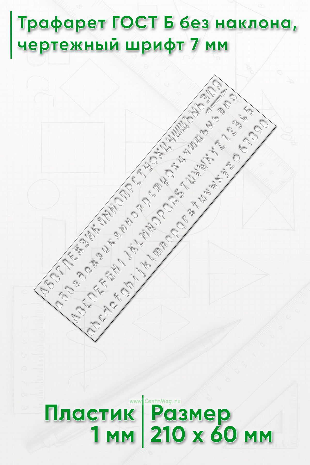 Трафарет для черчения ГОСТ 2.304-81 шрифт чертежный, тип Б с наклоном, 7 мм, прорезные буквы (21х6 см) (390 руб.)