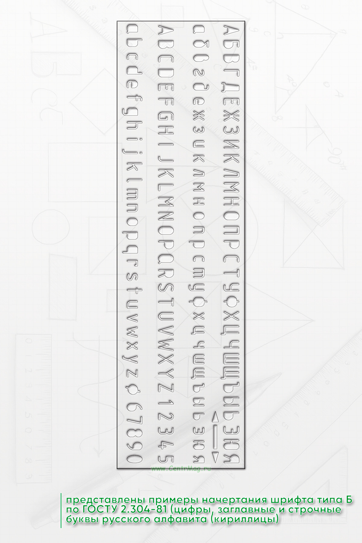На трафарете представлены примеры начертания шрифта типа Б по ГОСТу 2.304-81 (цифры, заглавные и строчные буквы русского алфавита (кириллицы). С помощью трафарета вы сможете сделать надписи высотой 5 и 7 мм.