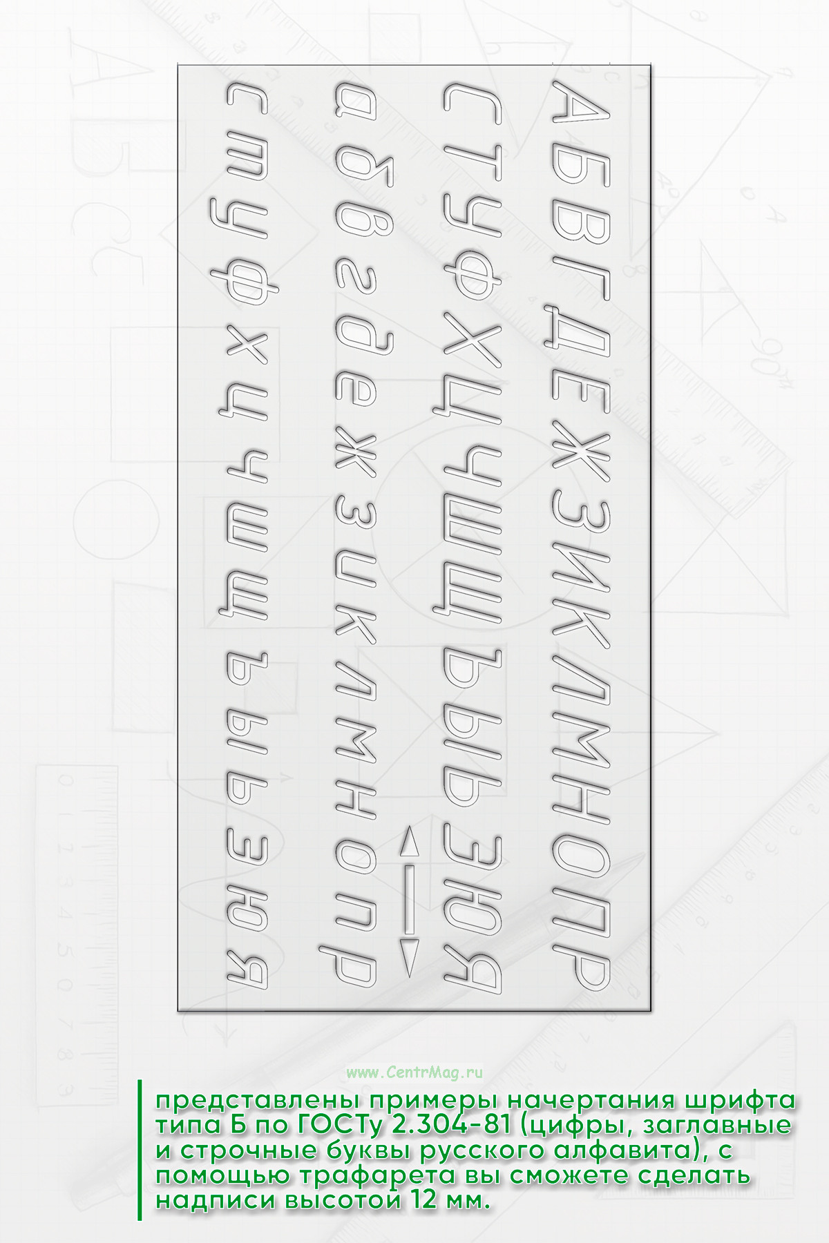 На трафарете представлены примеры начертания шрифта типа Б по ГОСТу 2.304-81 (цифры, заглавные и строчные буквы русского алфавита). С помощью трафарета вы сможете сделать надписи высотой 12 мм.