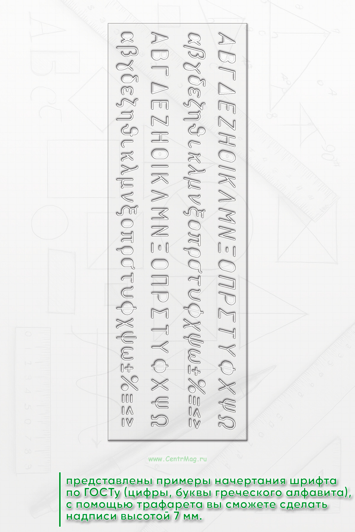 На трафарете представлены примеры начертания шрифта по ГОСТу (цифры, буквы греческого алфавита). С помощью трафарета вы сможете сделать надписи высотой 7 мм.
