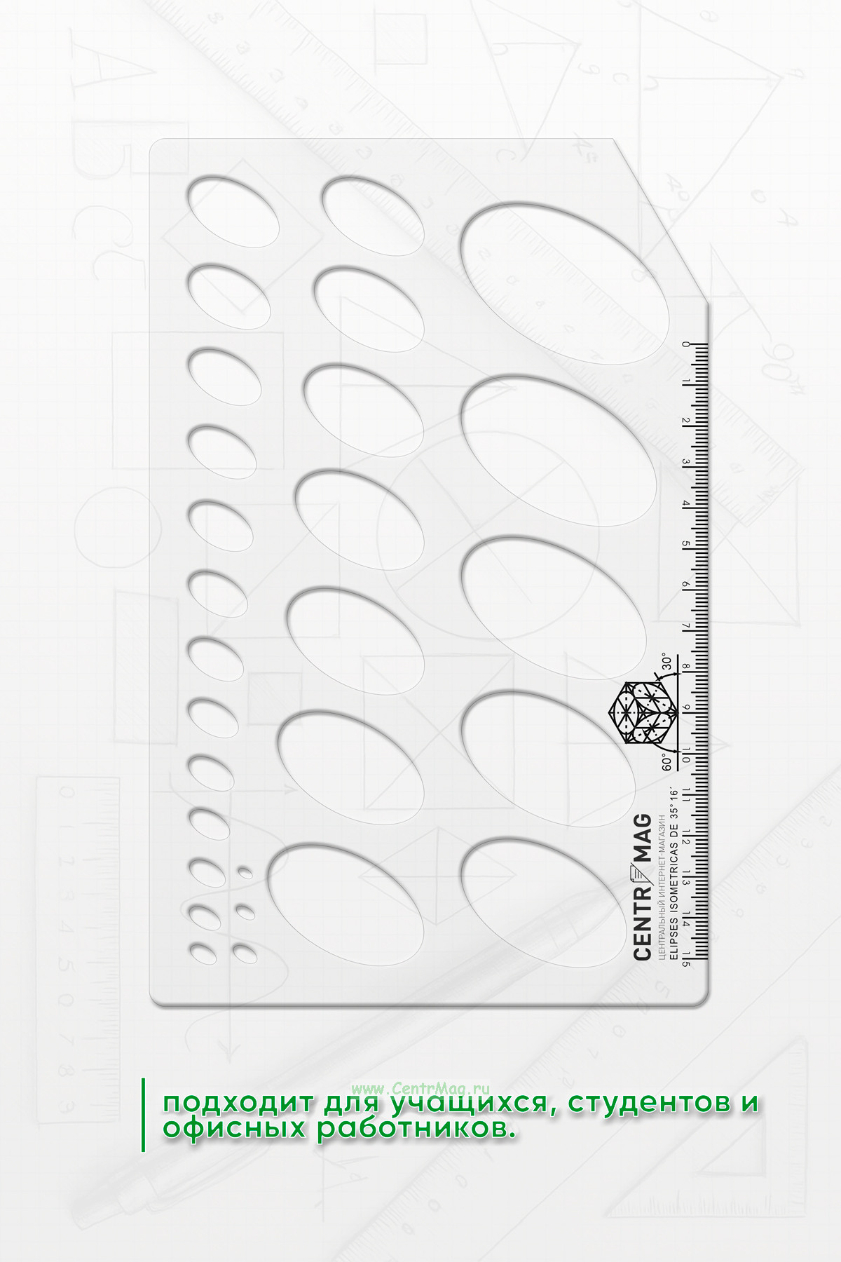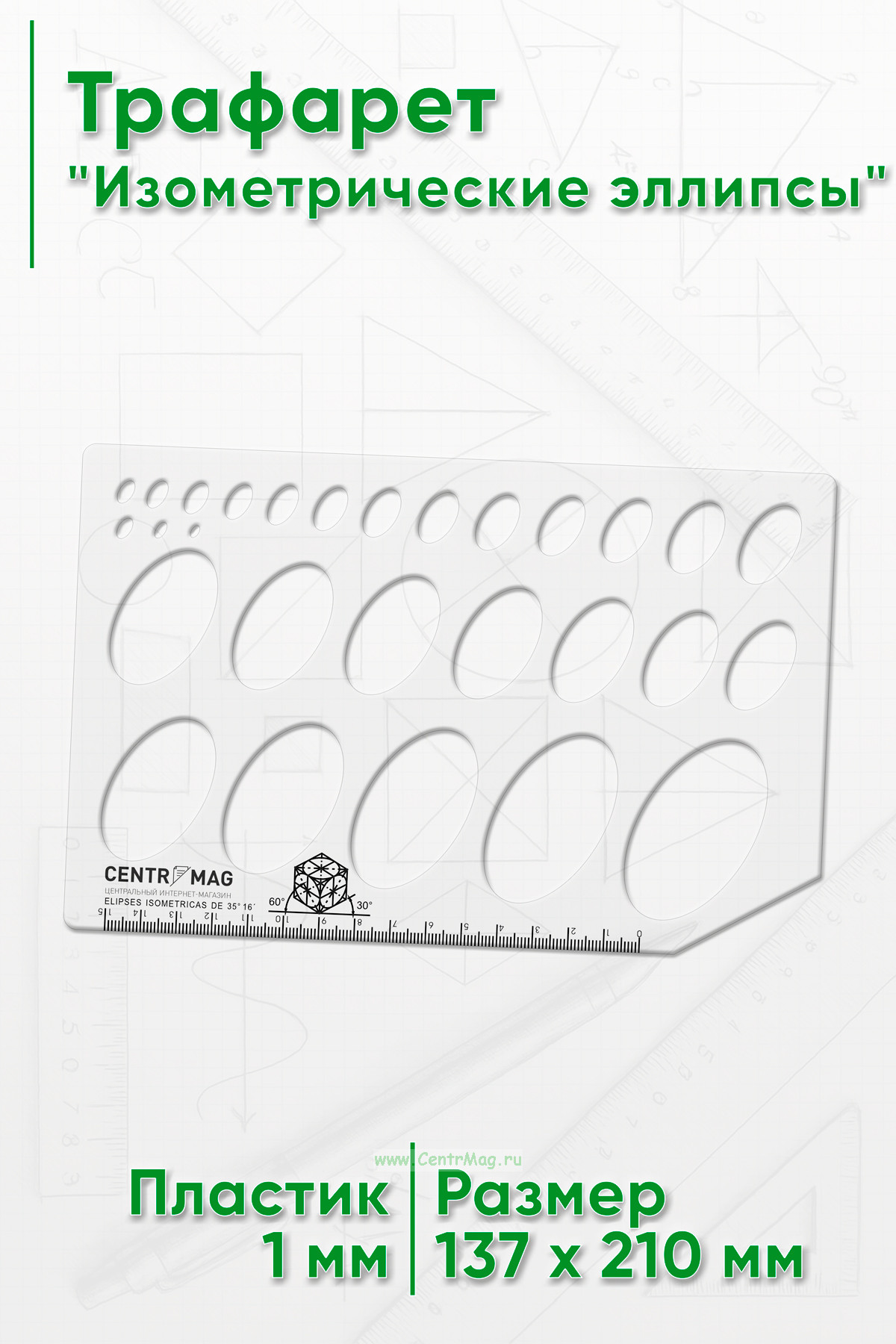 Трафарет "Изометрические эллипсы" имеет 28 одинаковых фигур разного размера и линейку. Идеально подходит для учащихся, студентов и офисных работников.