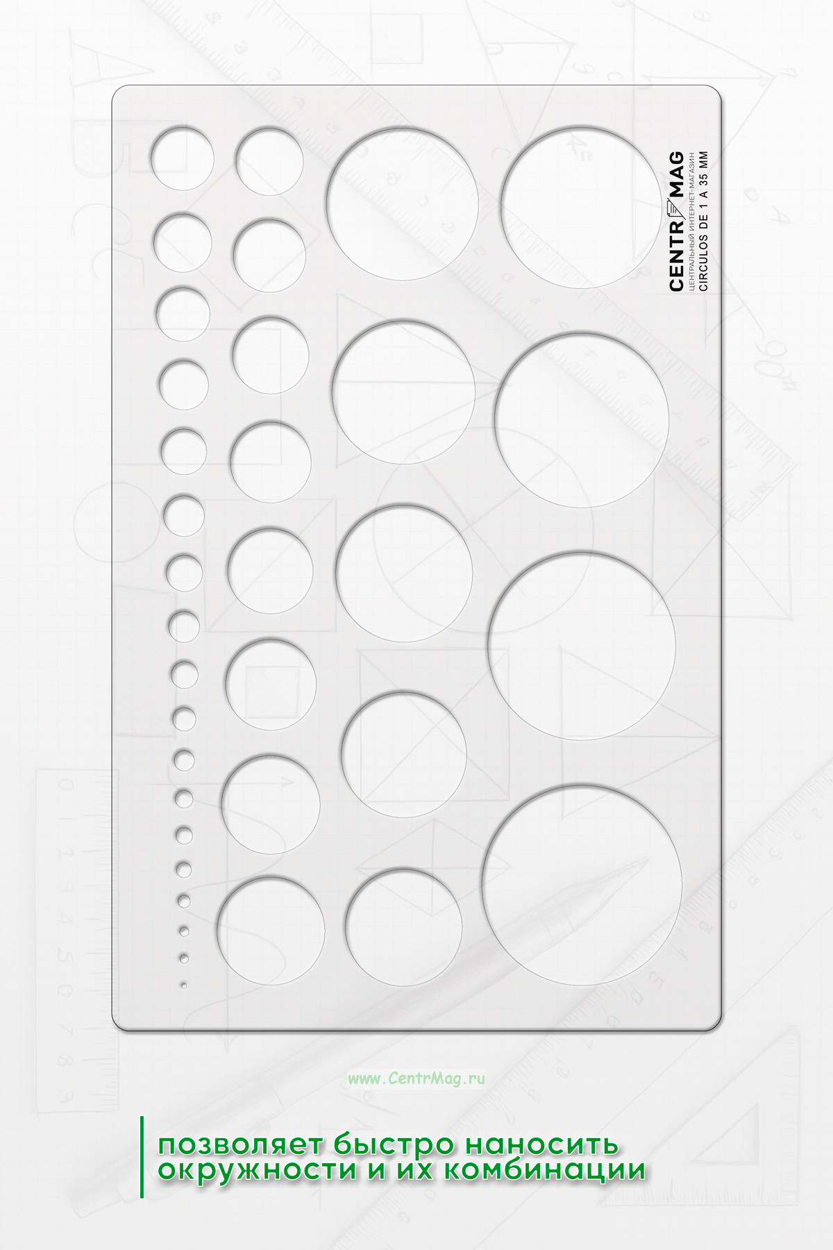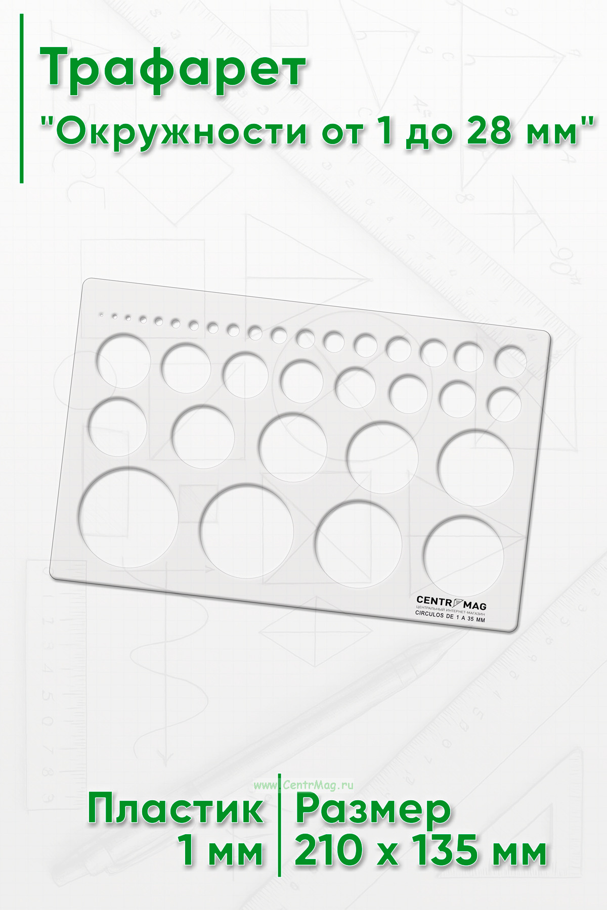 Трафарет позволяет быстро наносить окружности и их комбинации. В трафарете имеются круги с диаметром от 1 до 28 мм.