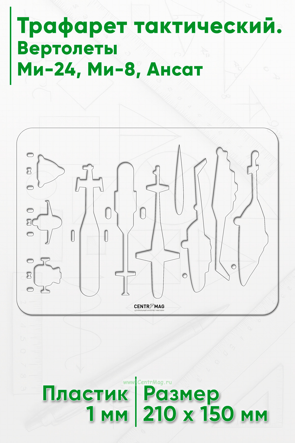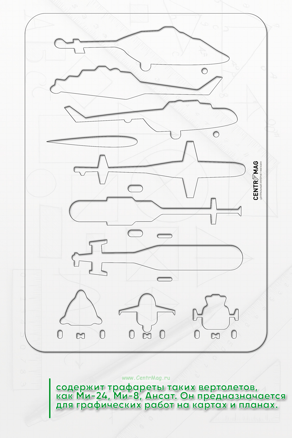 Инструмент содержит трафареты таких вертолетов, как Ми-24, Ми-8, Ансат. Он предназначается для графических работ на картах и планах.