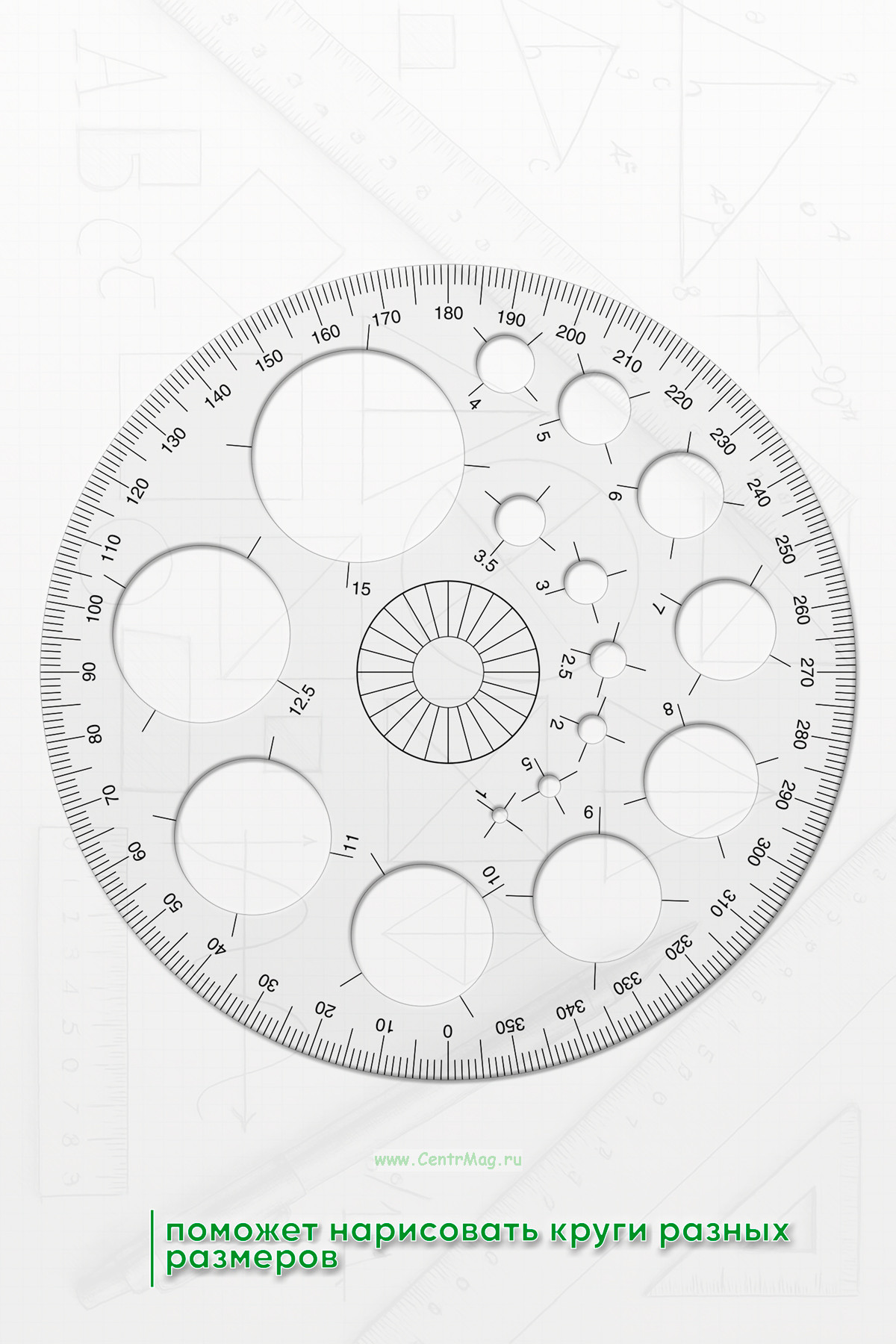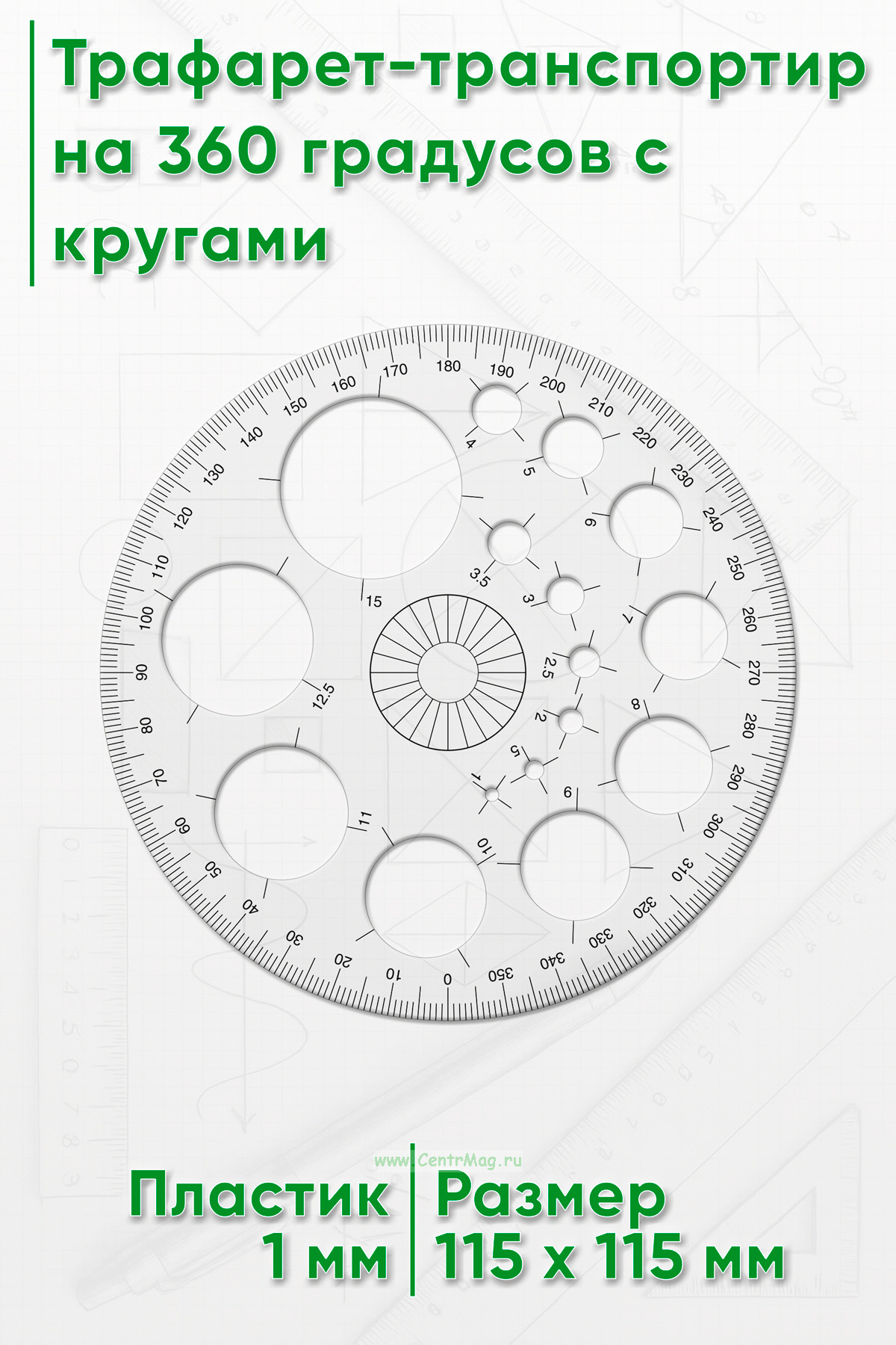 Трафарет-транспортир на 360 градусов с кругами