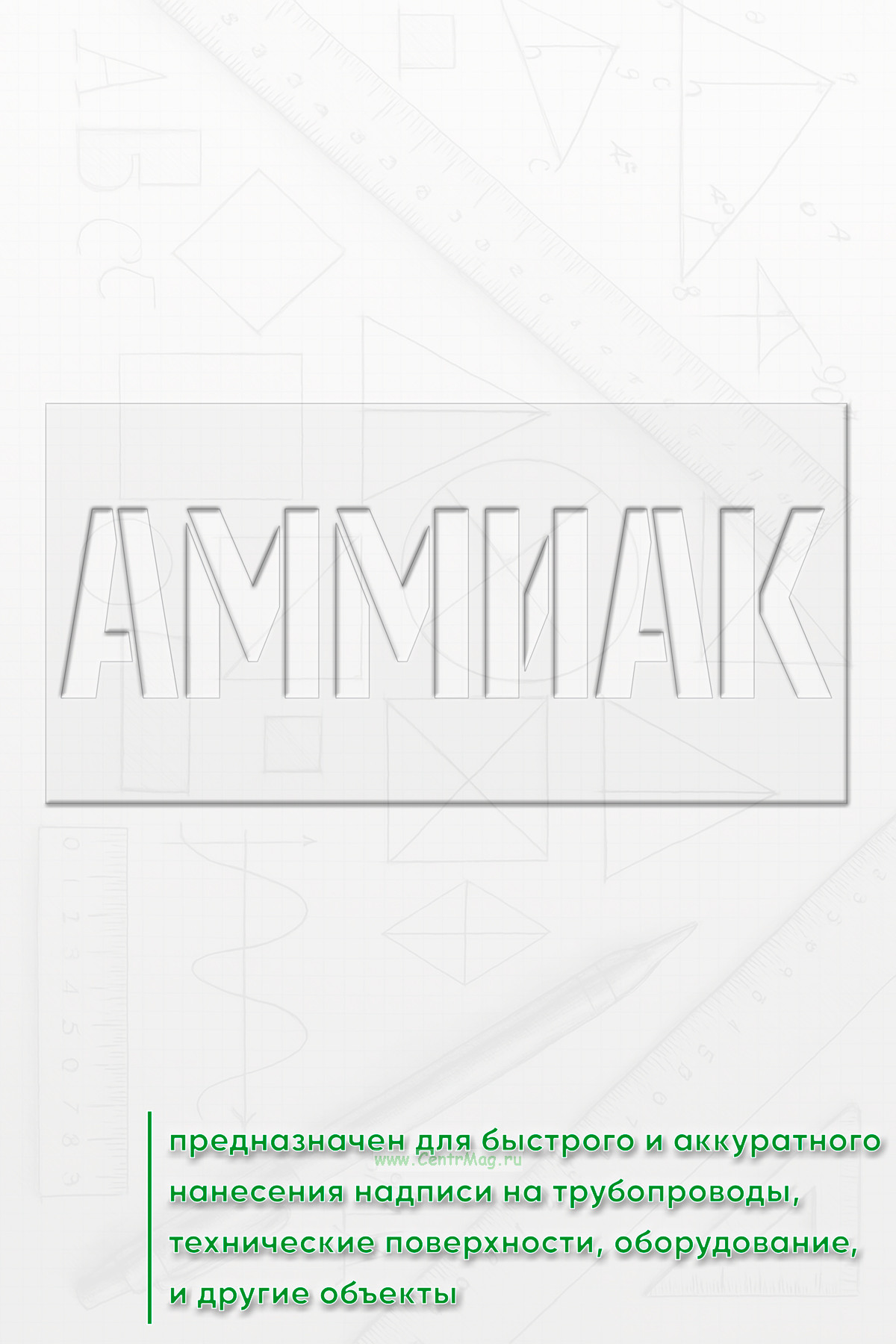 Трафарет "Аммиак" предназначен для быстрого и аккуратного нанесения надписи на трубопроводы, технические поверхности, оборудование, шкафы и другие объекты.