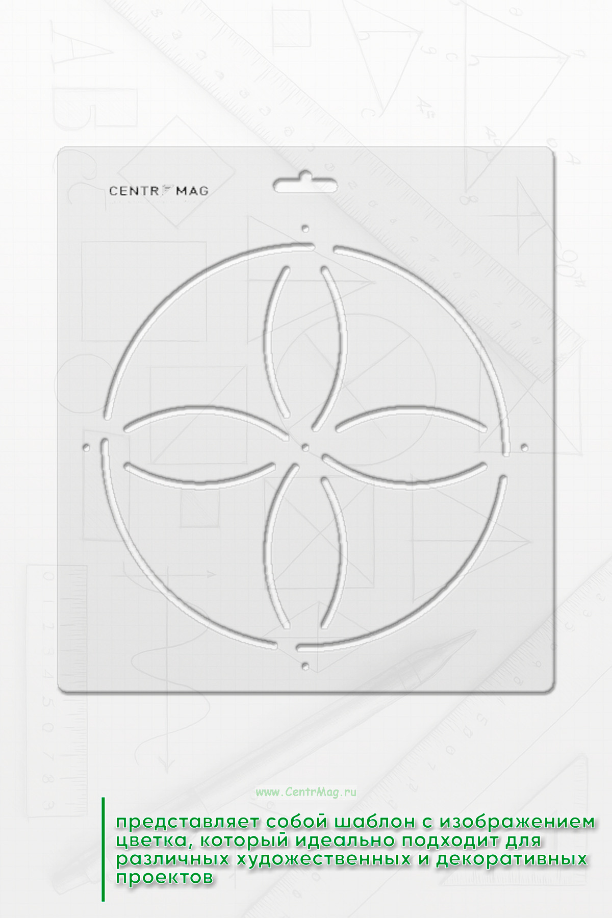 Трафарет представляет собой шаблон с изображением цветка, который идеально подходит для различных художественных и декоративных проектов. Он выполнен в простом, но элегантном дизайне, что позволяет легко использовать его как для новичков, так и для опытных мастеров
