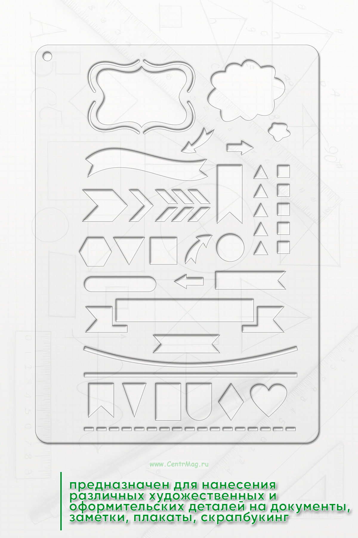 Трафарет "Декоративные элементы" предназначен для нанесения различных художественных и оформительских деталей на документы, заметки, плакаты, скрапбукинг, дневники и другие творческие проекты.