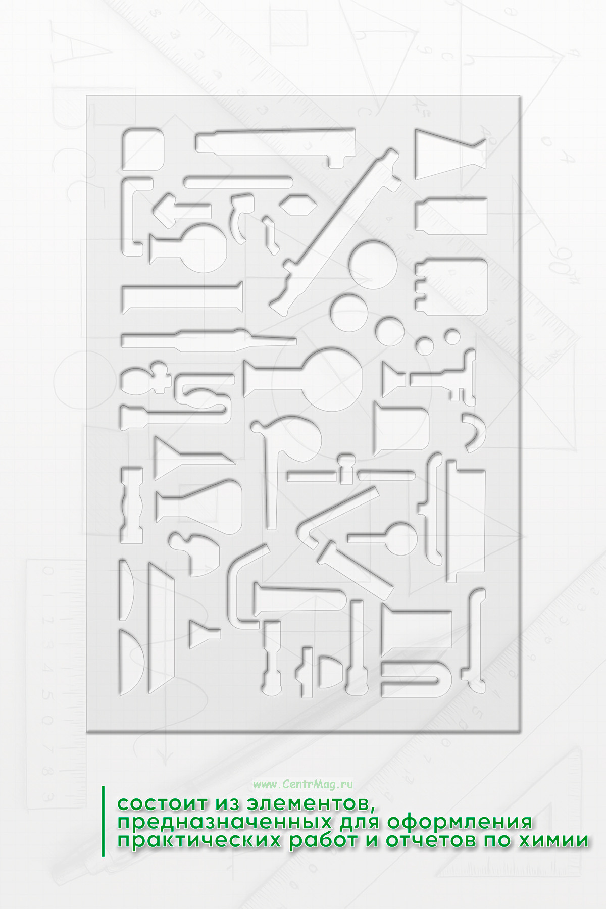 Линейка-трафарет состоит элементов, предназначенных для оформления практических работ и отчетов по химии
