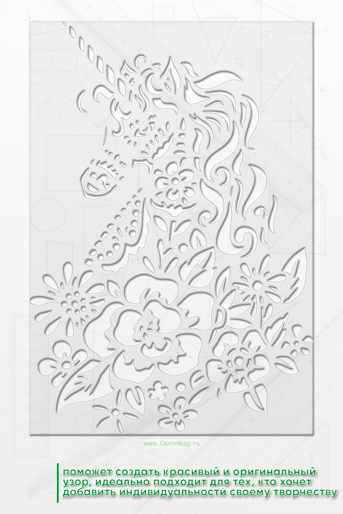 Трафарет поможет создать красивый и оригинальный узор. Идеально подходит для тех, кто хочет добавить индивидуальности своему творчеству.