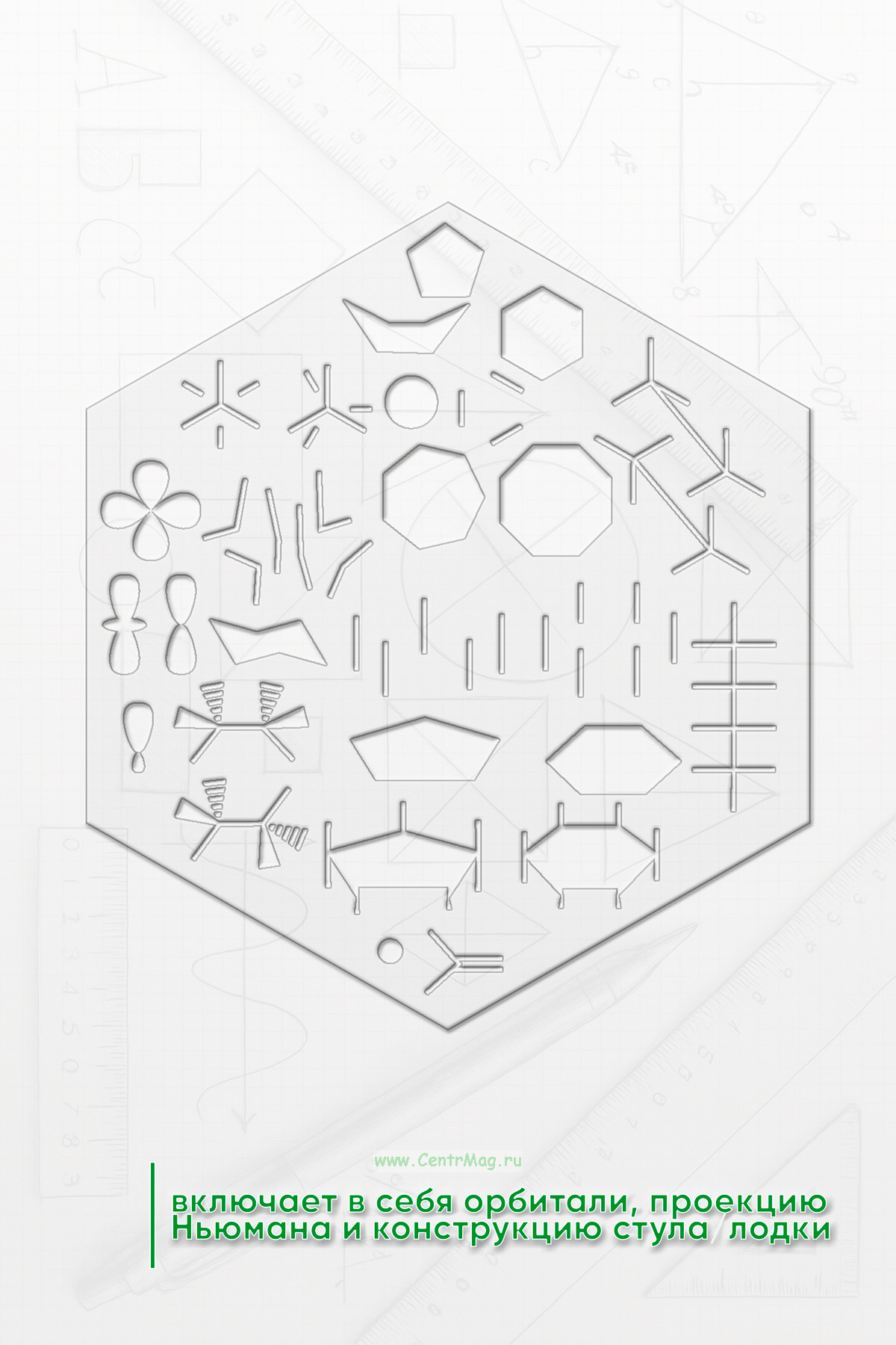 Шестиугольный трафарет для углубленной органической химии включает в себя орбитали, проекцию Ньюмана и конструкцию стула/лодки