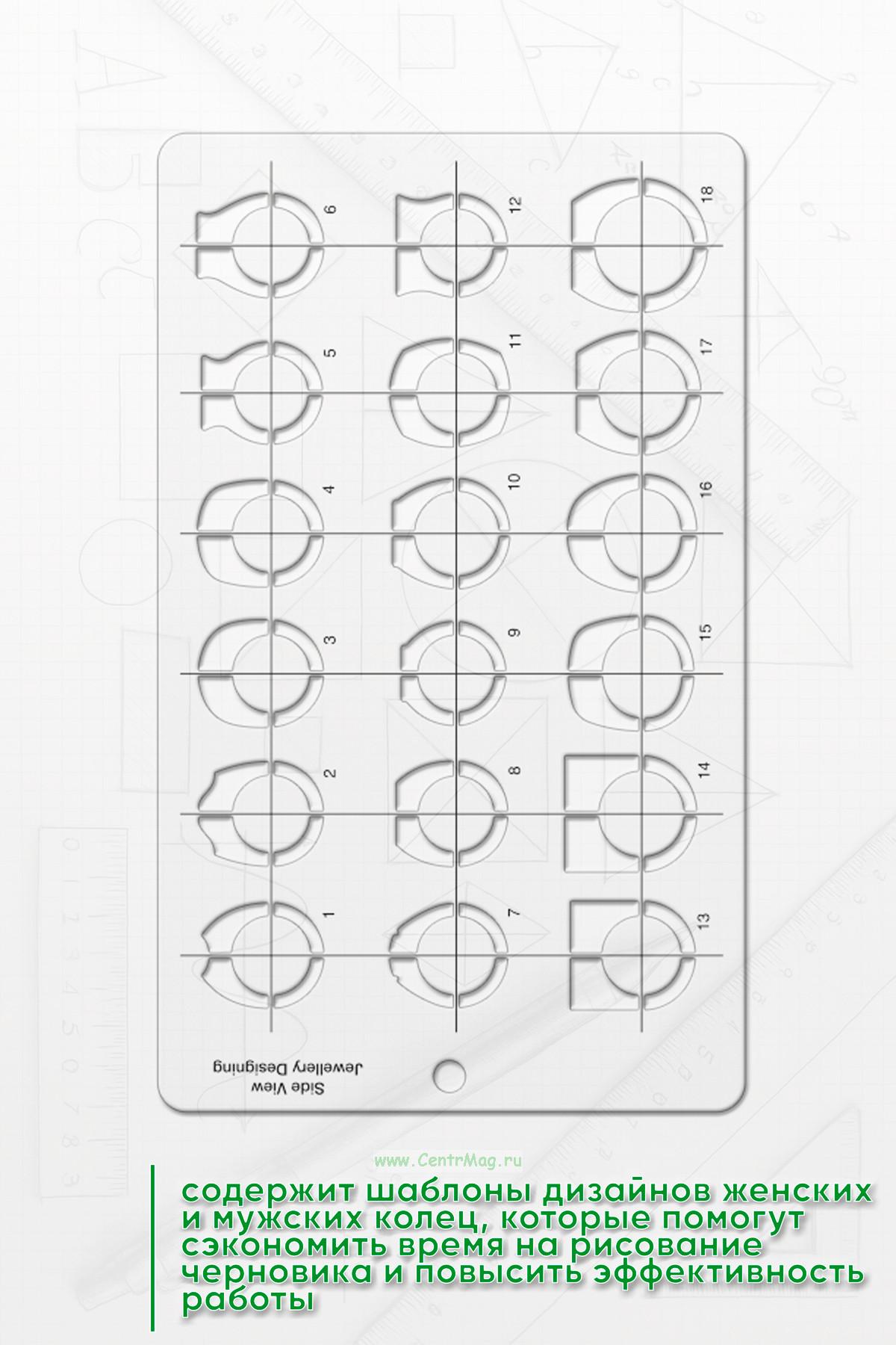 Трафарет используется для иллюстрации дизайна ювелирных изделий на бумаге. Содержит шаблоны дизайнов женских и мужских колец, которые помогут сэкономить время на рисование черновика и повысить эффективность работы.