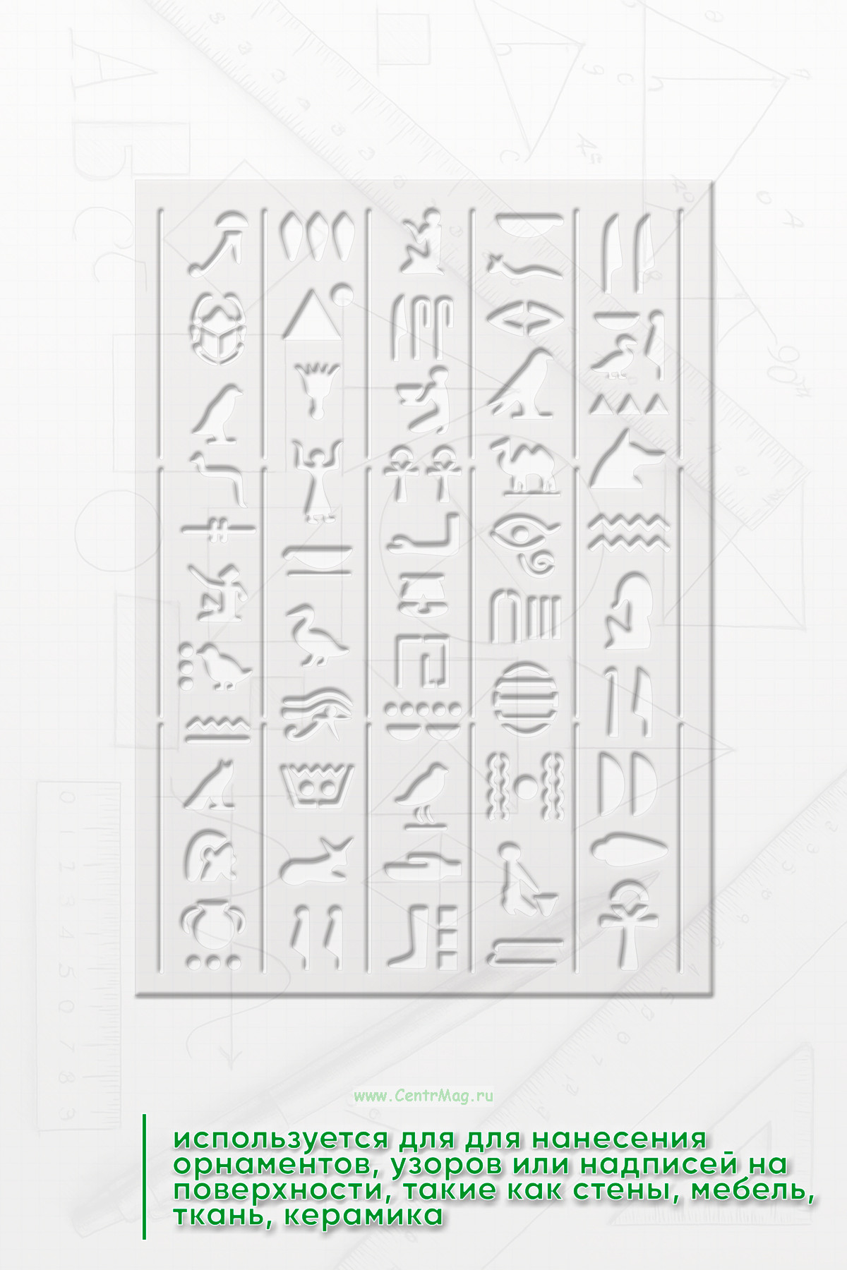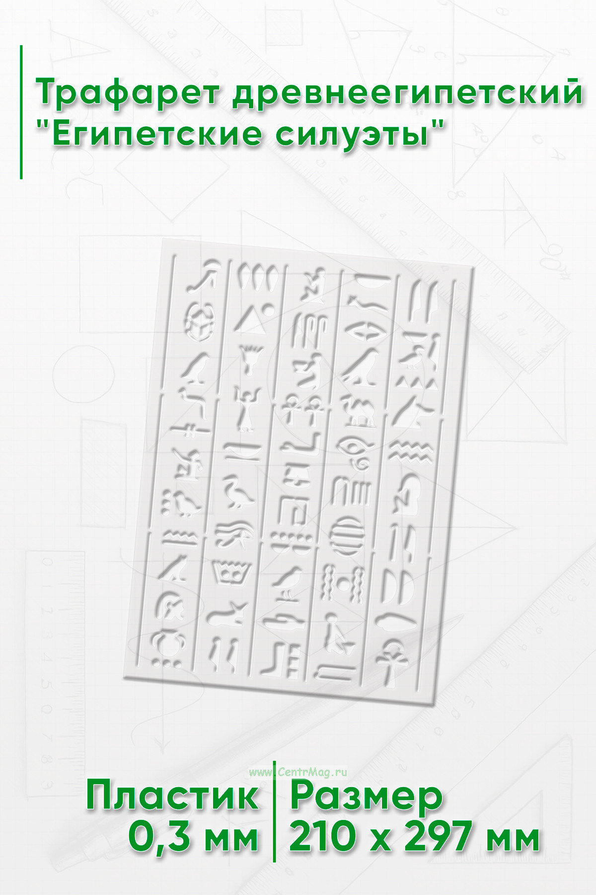 Трафарет древнеегипетский "Египетские силуэты" предназначен для создания изображений или надписей с мотивами, связанными с фараонами, древним Египтом или египетской символикой