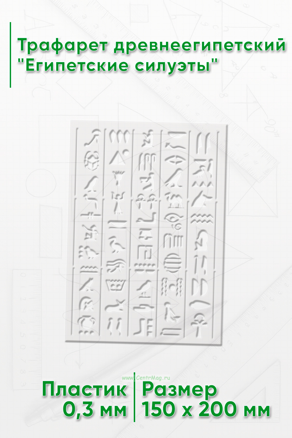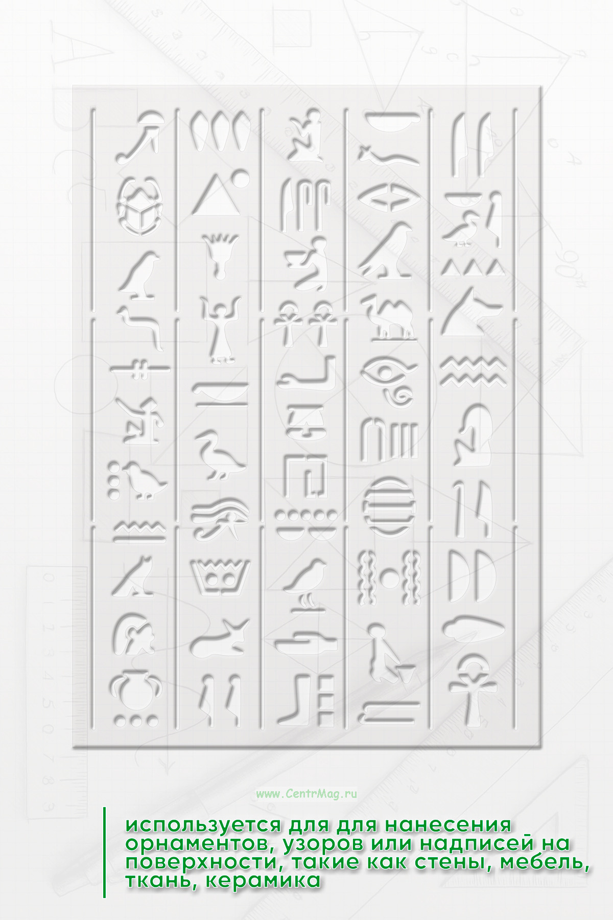 Трафарет древнеегипетский "Египетские силуэты" предназначен для создания изображений или надписей с мотивами, связанными с фараонами, древним Египтом или египетской символикой