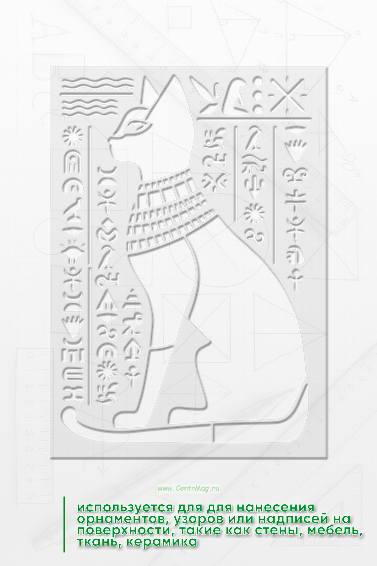 Трафарет древнеегипетский "Кошка и Иероглифы" предназначен для создания изображений или надписей с мотивами, связанными с фараонами, древним Египтом или египетской символикой
