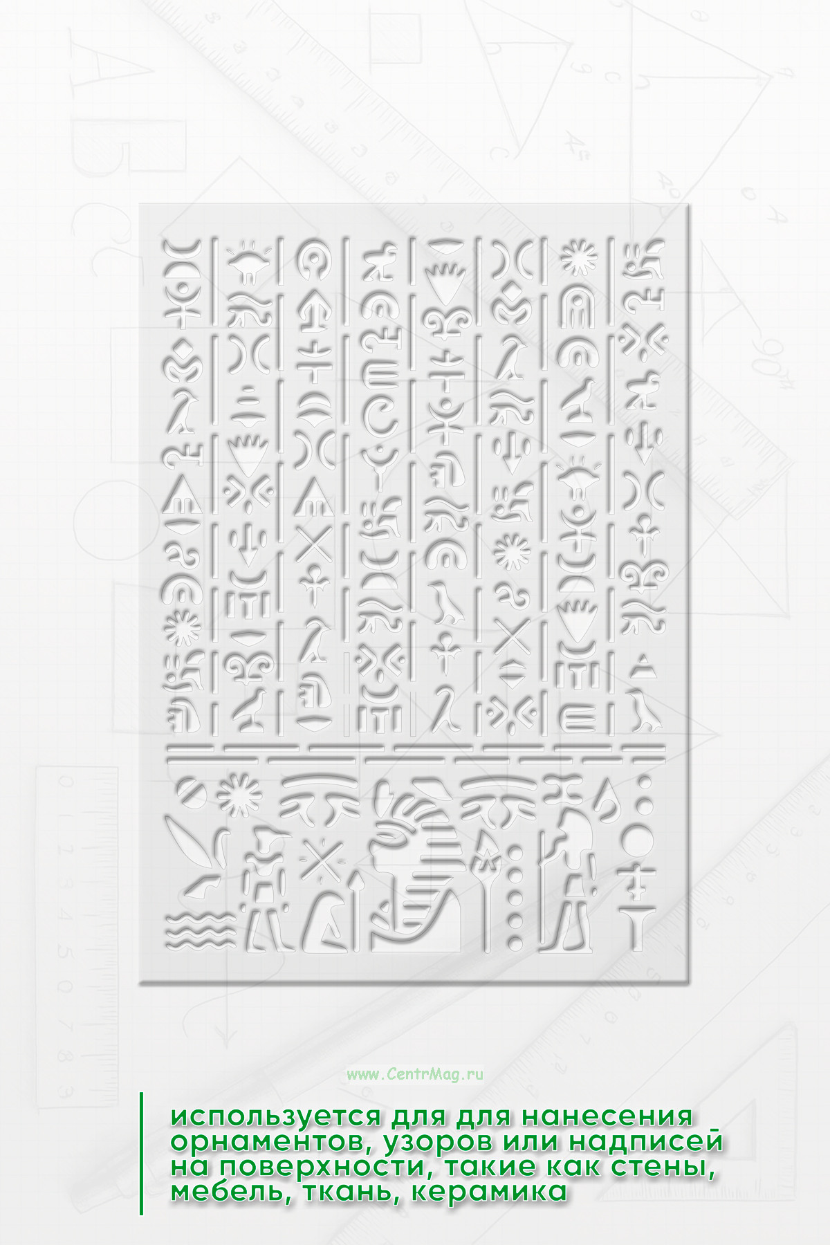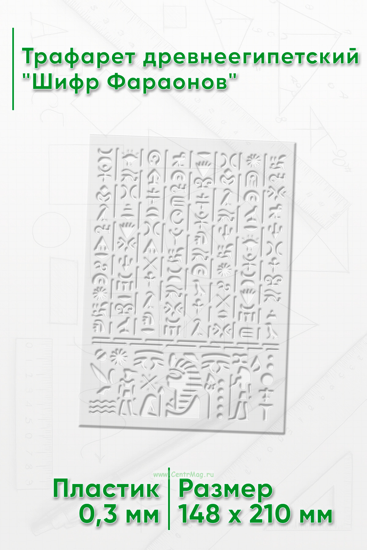 Трафарет древнеегипетский "Шифр Фараонов" предназначен для создания изображений или надписей с мотивами, связанными с фараонами, древним Египтом или египетской символикой