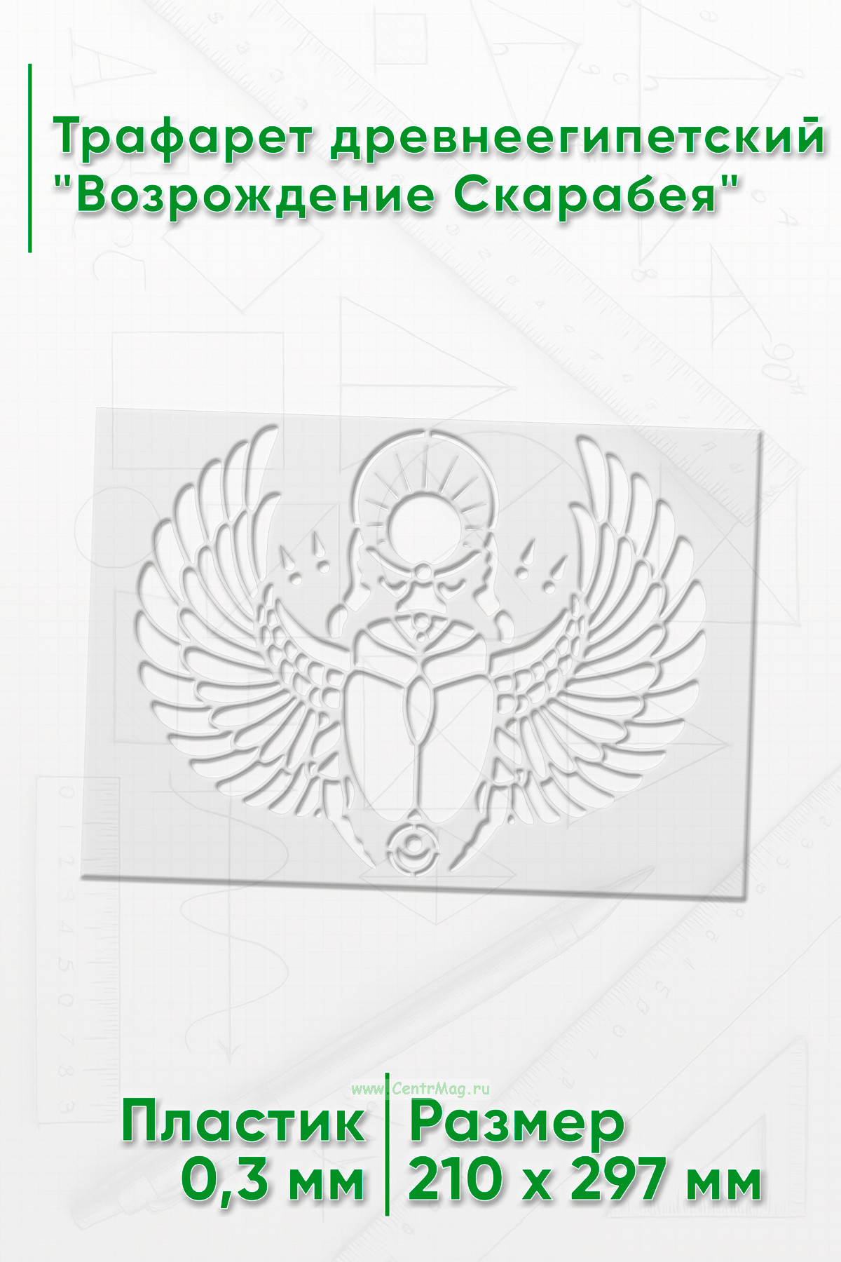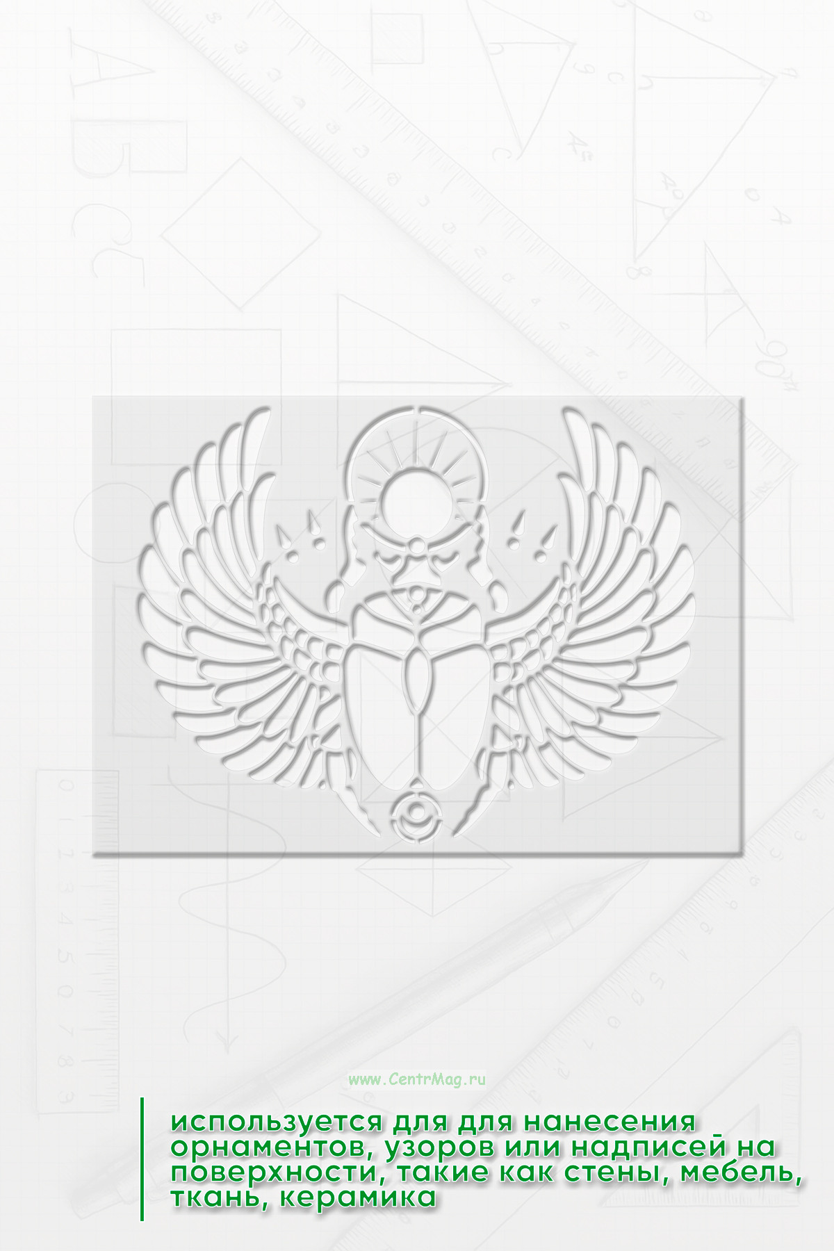 Трафарет древнеегипетский "Возрождение Скарабея" предназначен для создания изображений или надписей с мотивами, связанными с фараонами, древним Египтом или египетской символикой