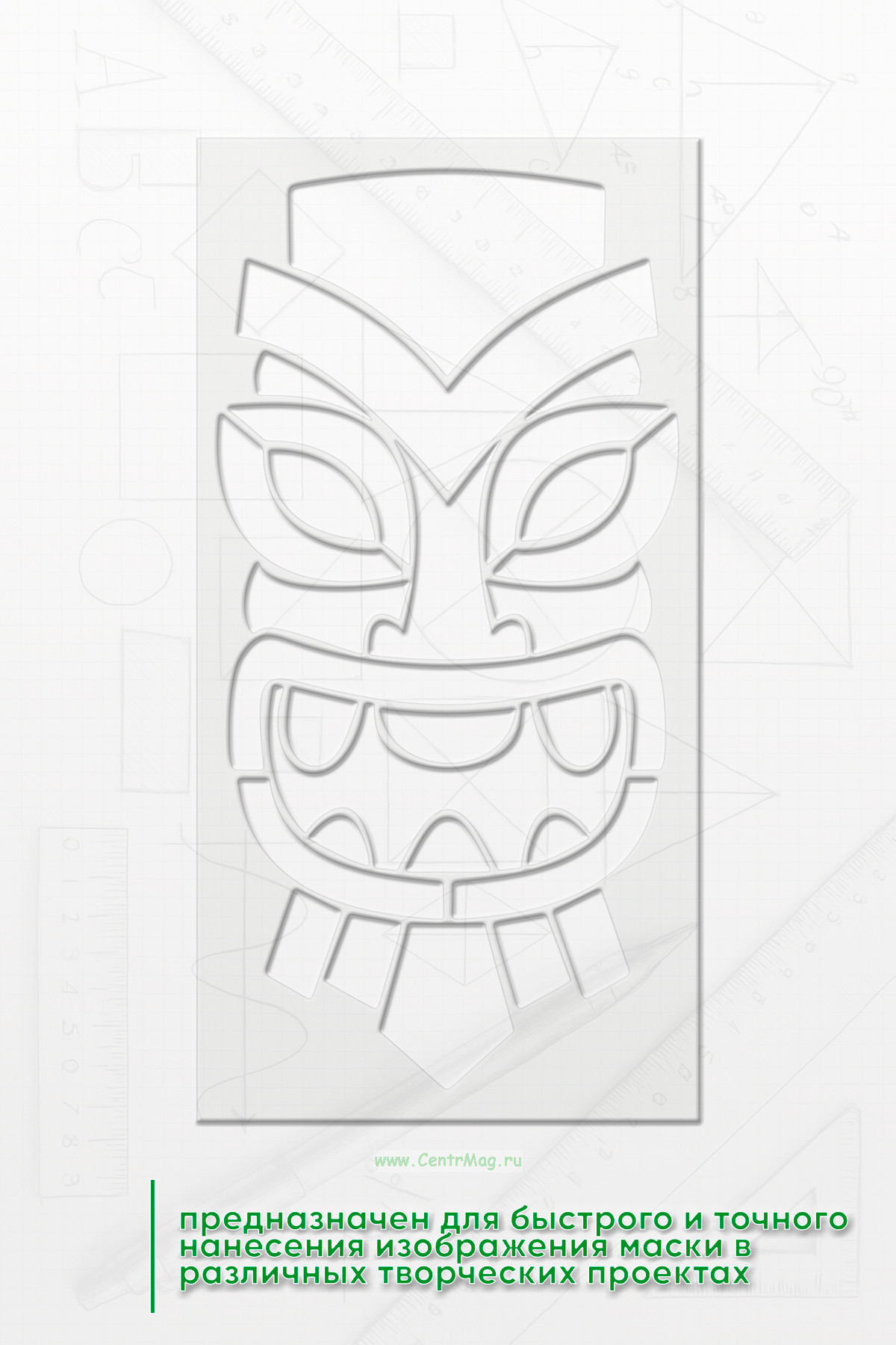 Трафарет "Древний защитник" предназначен для быстрого и точного нанесения изображения маски в различных творческих проектах. Он помогает создать эффект аутентичной древней маски, подчеркивая стиль и атмосферу исторического или фантастического образа.