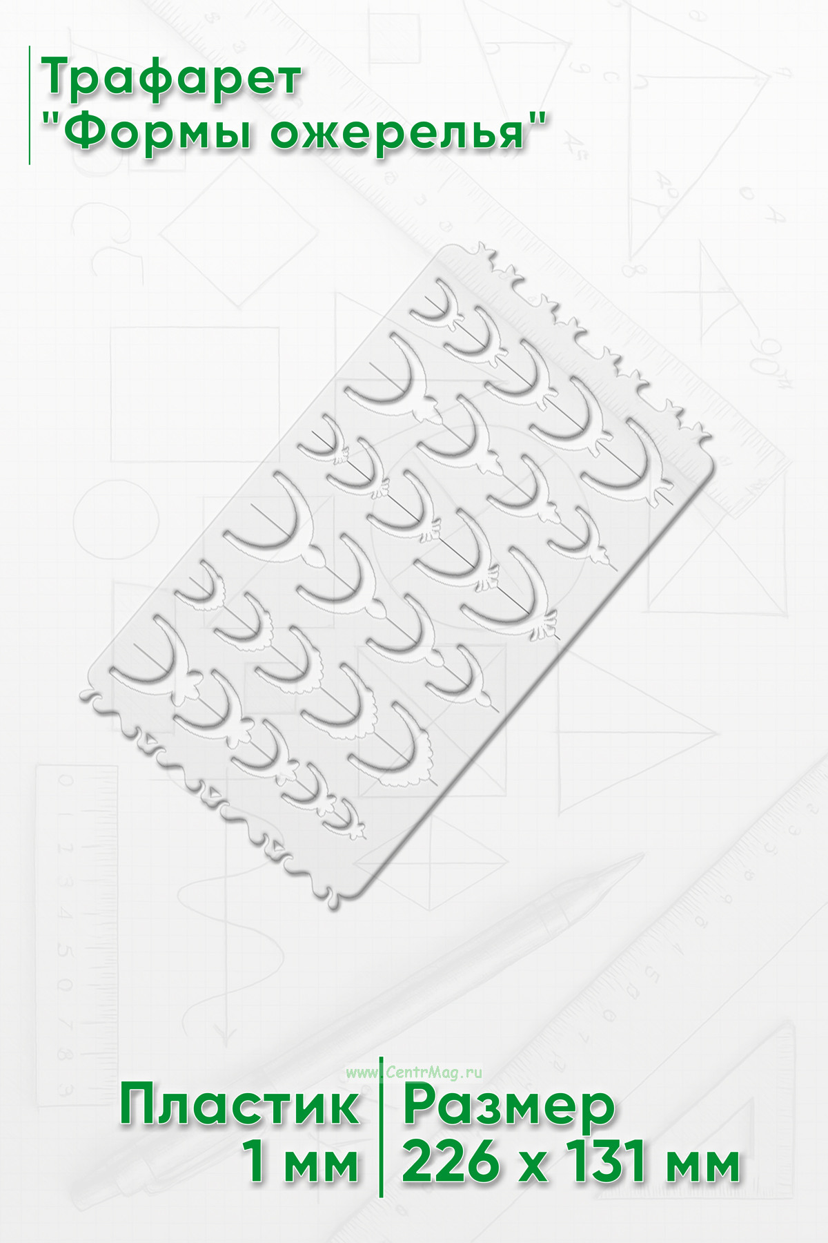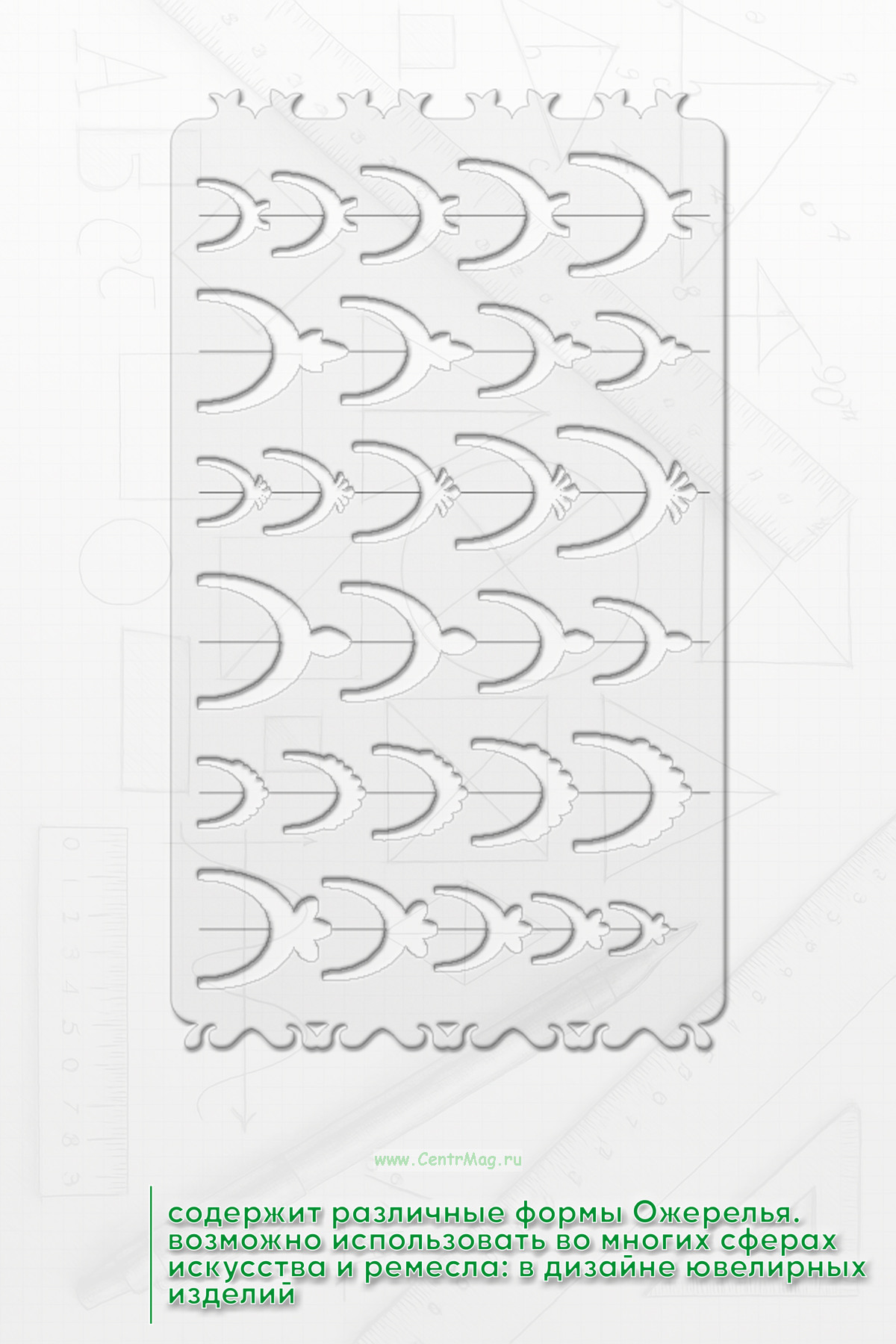 Трафарет содержит различные формы Ожерелья. Возможно использовать во многих сферах искусства и ремесла: в дизайне ювелирных изделий, иллюстраций и открыток, а также для рисования фигур на различных поверхностях.