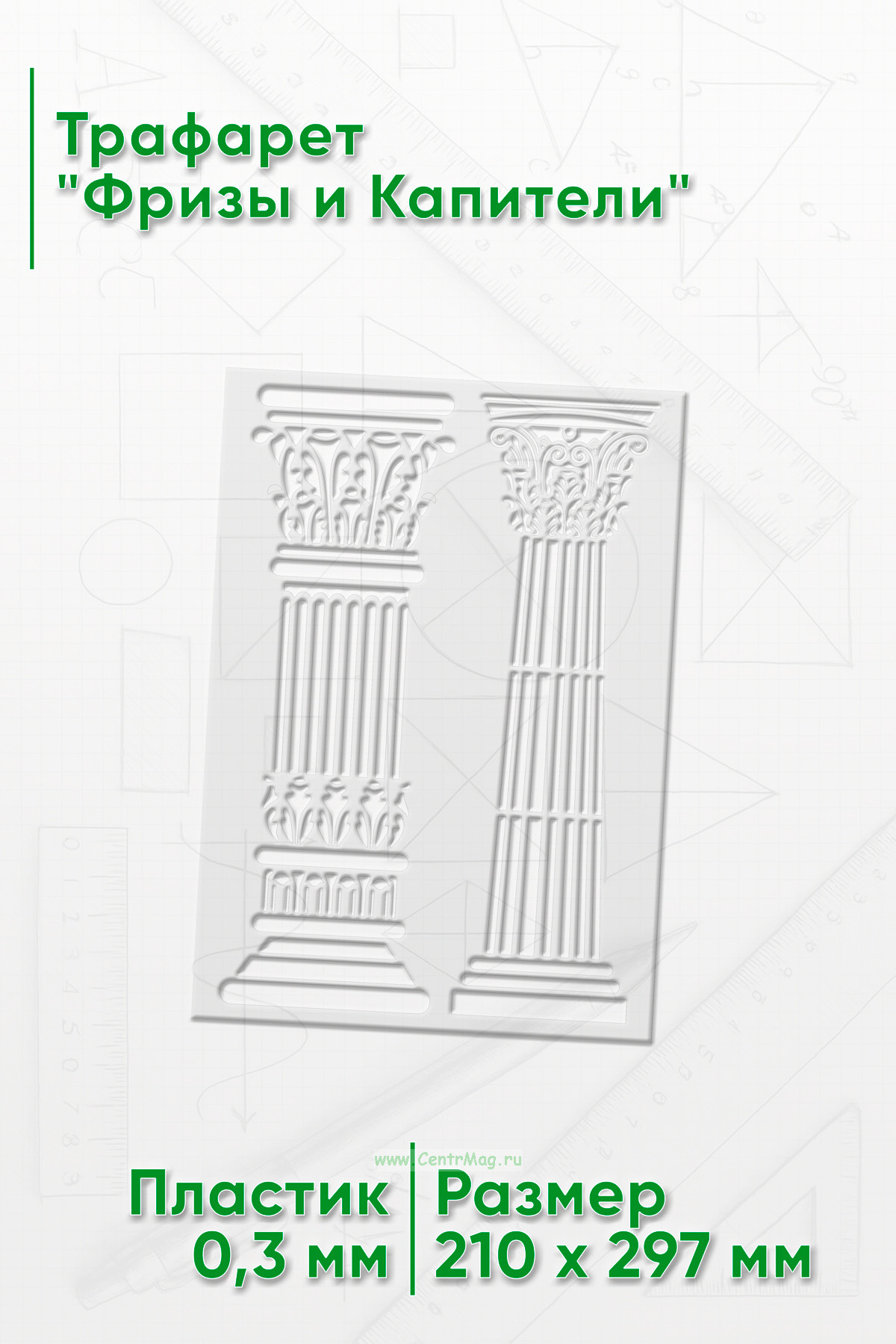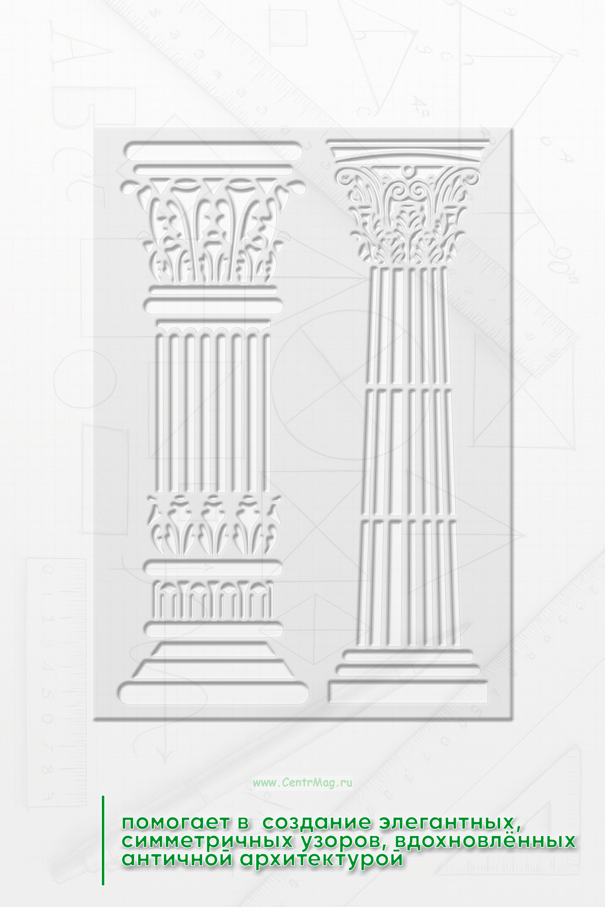 Трафарет "Фризы и Капители" помогает в создание элегантных, симметричных узоров, вдохновлённых античной архитектурой.